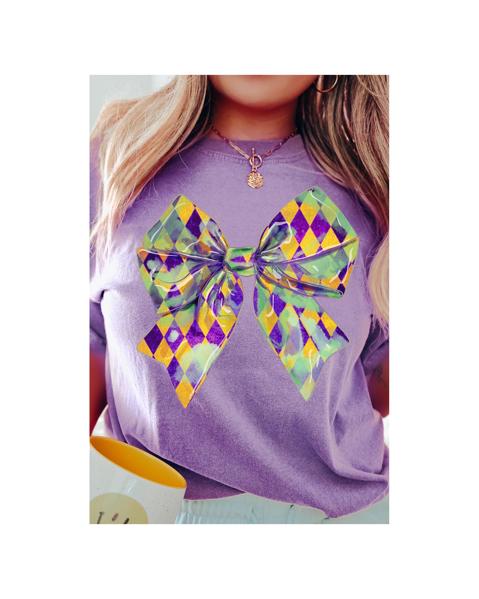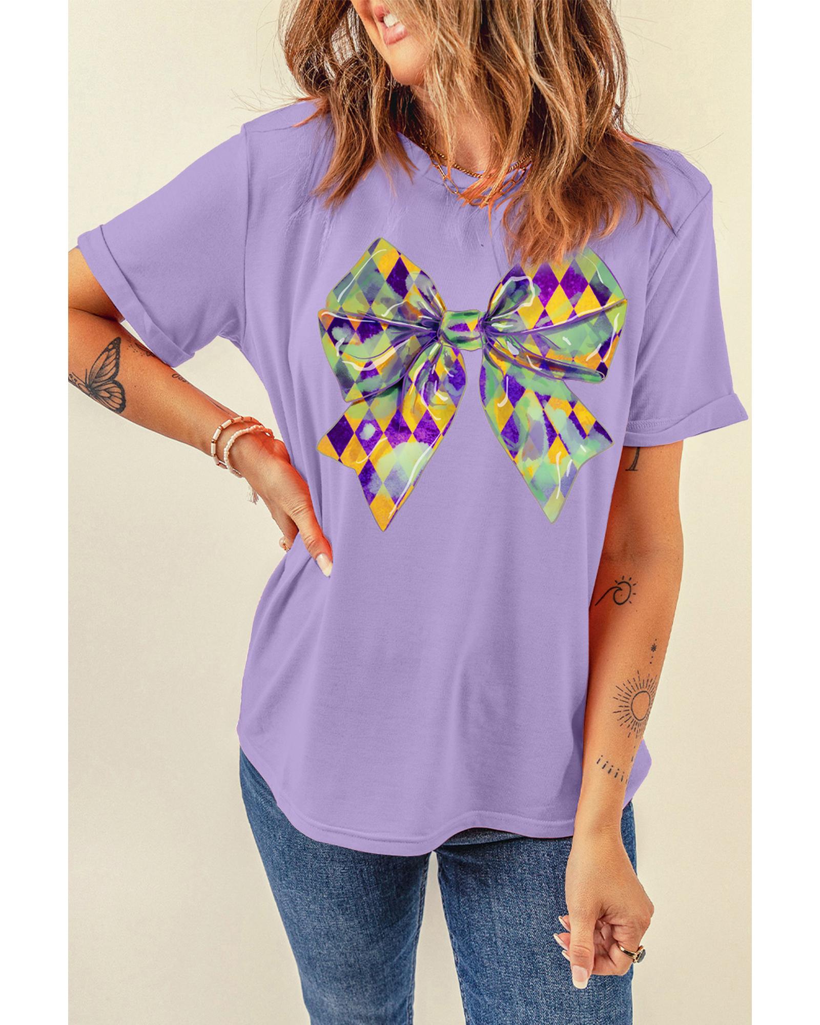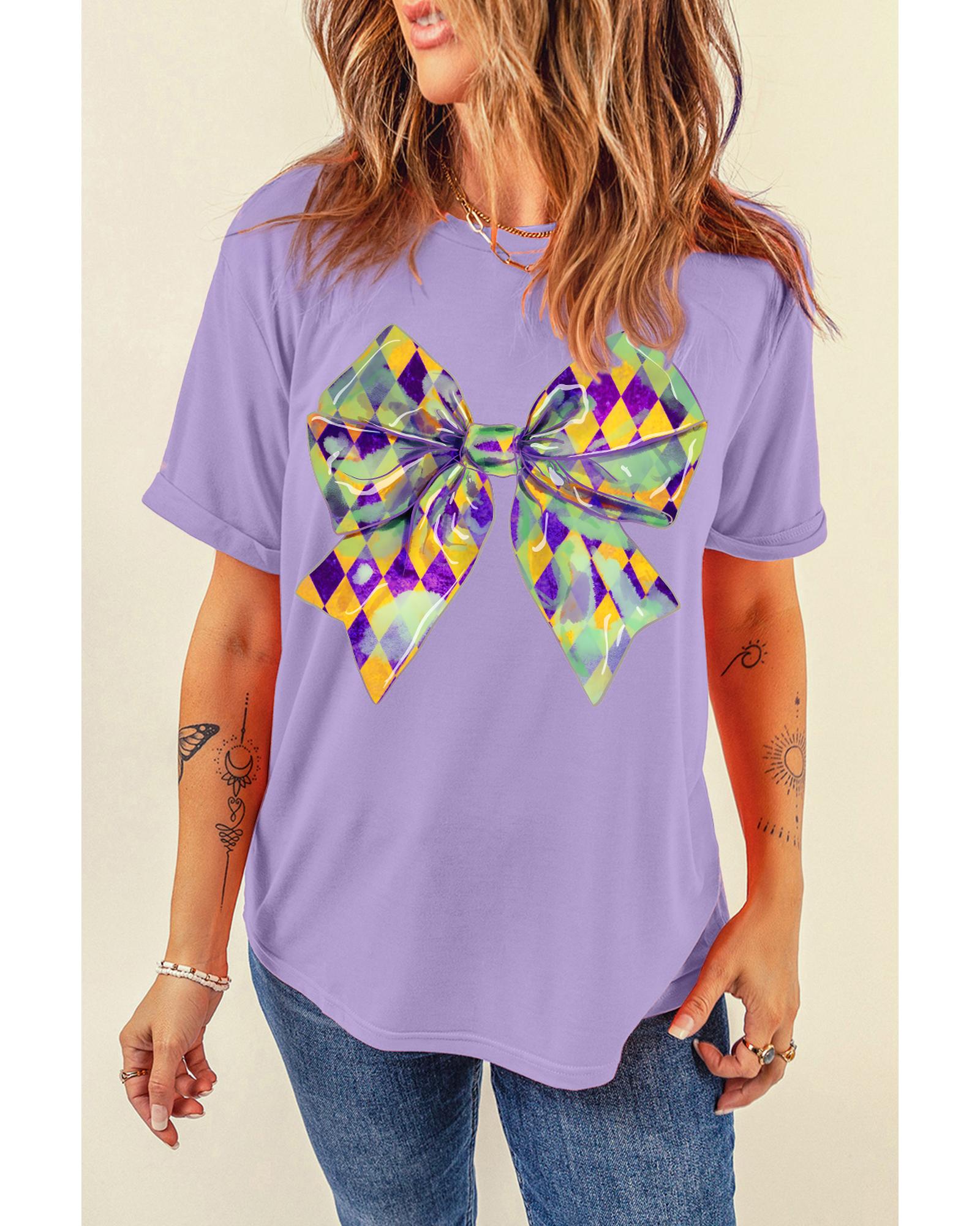 Wisteria Mardi Gras Bowknot Pattern Crew Neck T Shirt – L