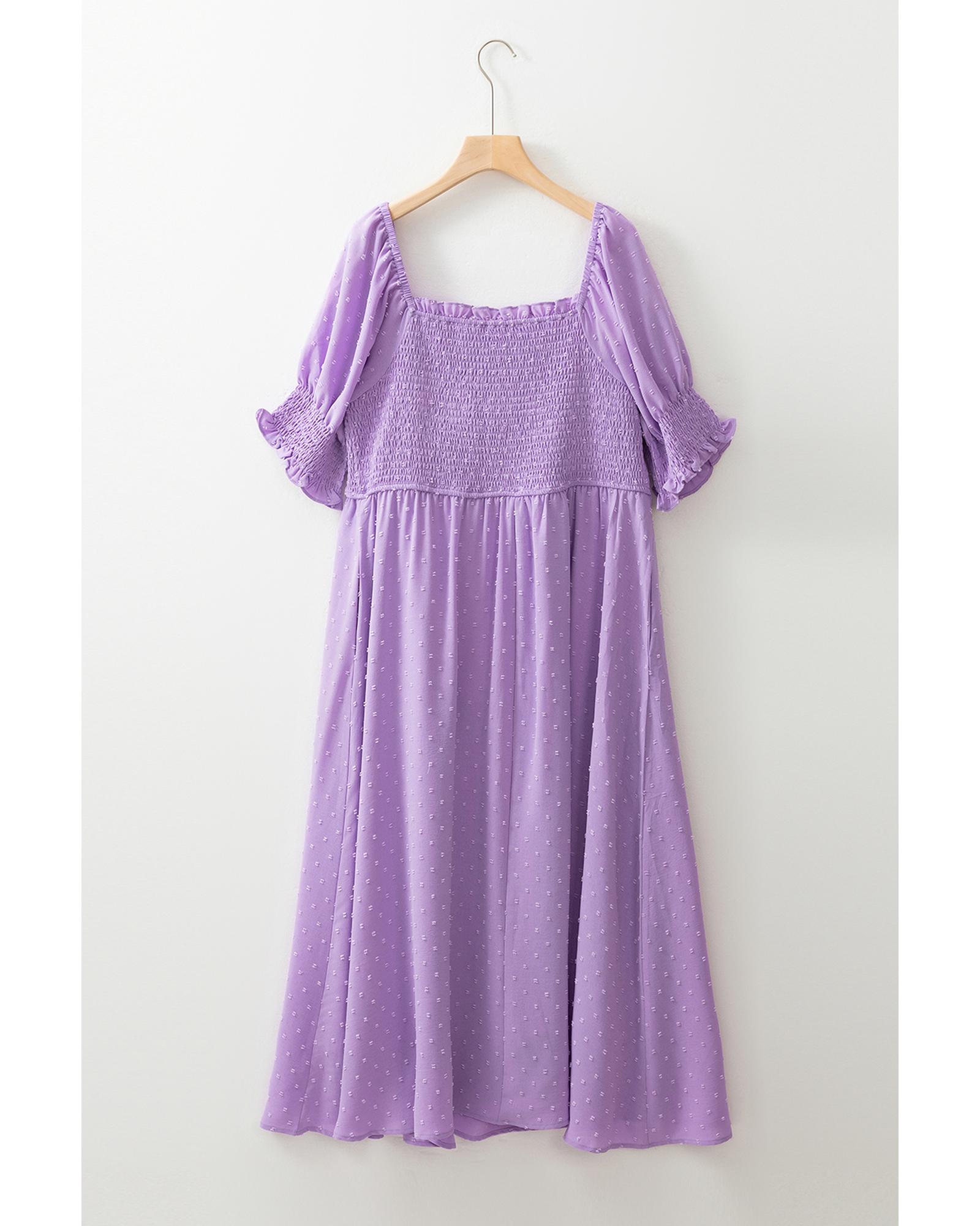 This plus size dress features a charming frilled neckline and a flattering smocked bodice, combining elegance and comfort. The feminine Swiss dot fabric adds a sophisticated touch, while the long silhouette creates a slender and graceful appearance.