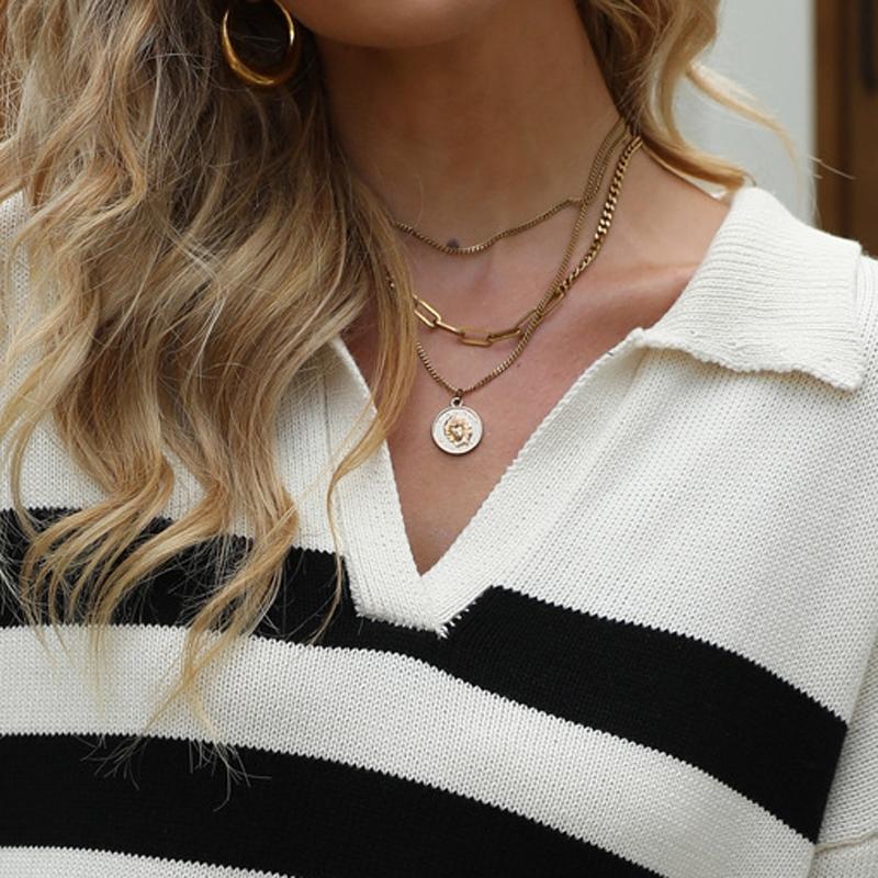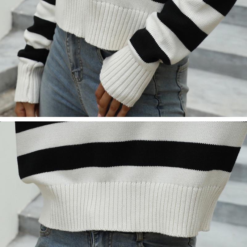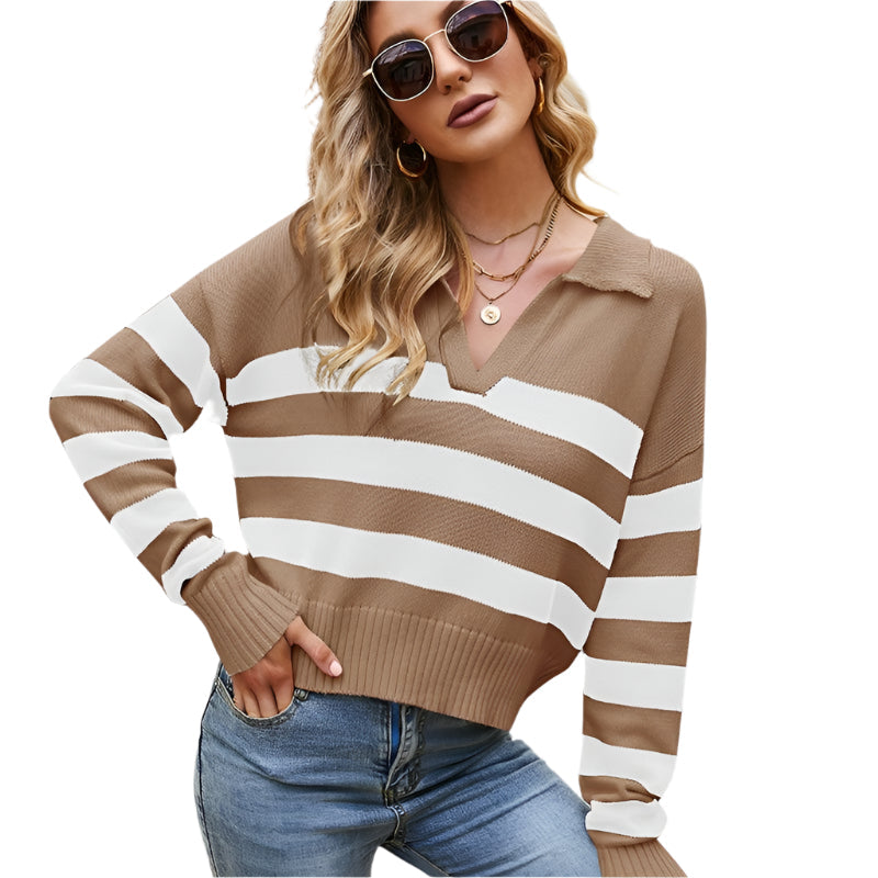 This women’s pullover sweater features a classic striped pattern with a lapel collar, offering a simple yet stylish look. Designed for comfort and versatility, it combines soft fabric with a relaxed fit, making it suitable for casual wear.