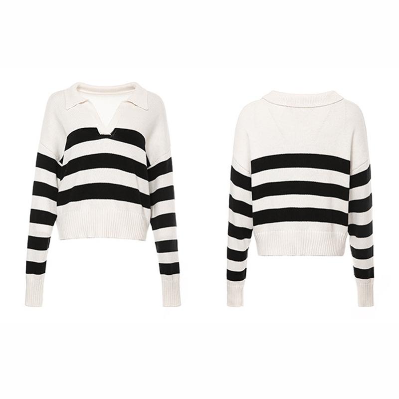 This women’s pullover sweater features a classic striped pattern with a lapel collar, offering a simple yet stylish look. Designed for comfort and versatility, it combines soft fabric with a loose fit, making it suitable for casual wear.
