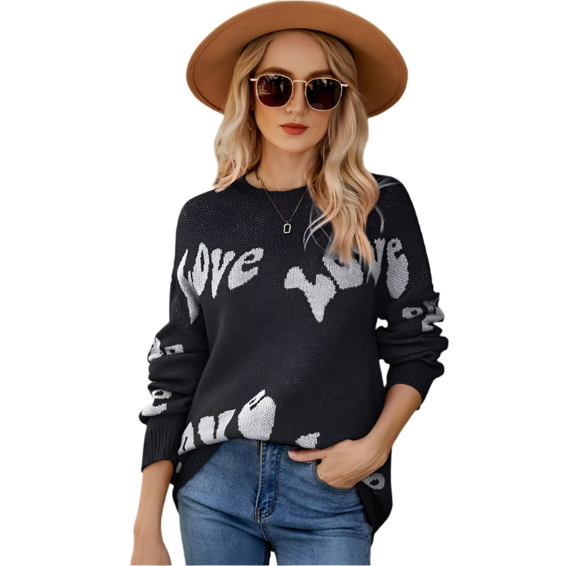 Women Round Neck Knitted Sweater Letters Jacquard Pullover Sweater – Size M – Black