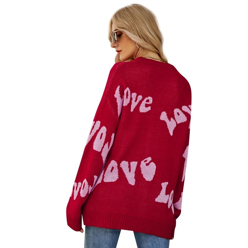 This women’s round neck knitted sweater features a stylish letters jacquard pattern, offering a comfortable and casual look. Made from soft and breathable fabric, it is suitable for everyday wear and provides both comfort and style.