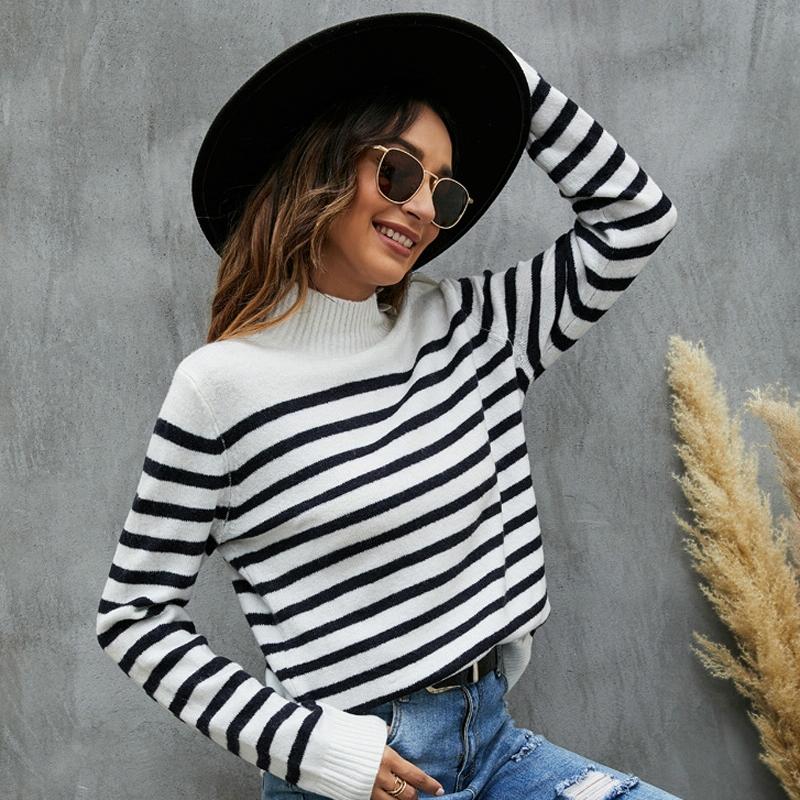 This women’s striped knitwear pullover features a loose fit with a stand-up collar, offering a stylish and comfortable option for everyday wear. The classic black and white stripes add a timeless touch to your wardrobe, suitable for both casual and professional settings.