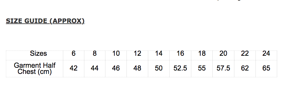 Size specifications are approximately as follows: the garment half chest measurement ranges from 42 cm for size 6 up to 65 cm for size 24. Please refer to the size guide for detailed measurements.
