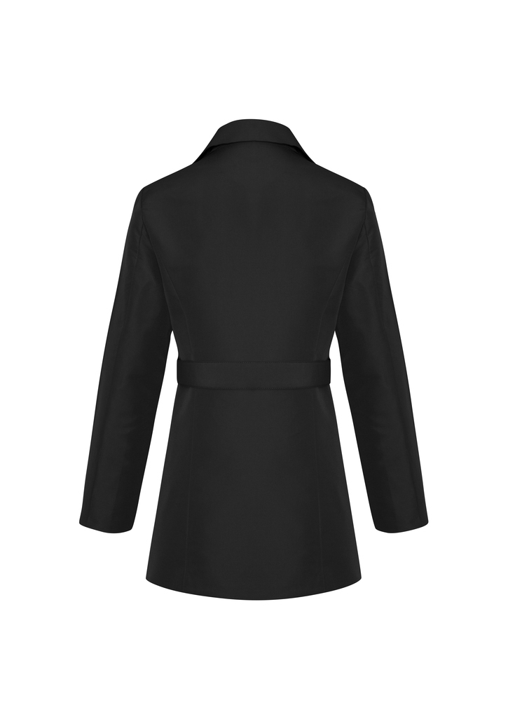 This women’s winter long trench coat offers a stylish and functional design, perfect for cold weather. It features a fully lined polyester shell and lining, providing warmth and comfort. The coat includes a concealed button front with a waist tie for a tailored fit, along with zip access for embroidery. It is available in a classic black color and has a modern fit for a contemporary look.
