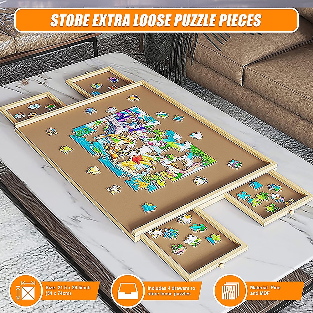 This wooden jigsaw puzzle table board offers a practical solution for puzzle enthusiasts to work on and store their puzzles conveniently. It features a flat, portable surface with built-in storage drawers, making it easy to organize and protect puzzle pieces during breaks or when not in use.