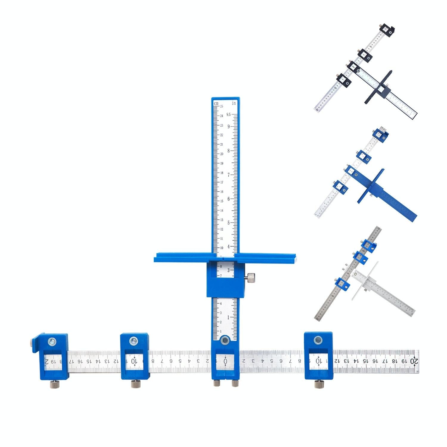 This woodworking punch locator is designed for precise positioning of cabinet door holes. It features adjustable measurements, a detachable design for easy assembly, and flexible adjustments to suit various projects. The tool includes a clear, rust-resistant laser scale, ensuring durability and accuracy for efficient woodworking tasks.