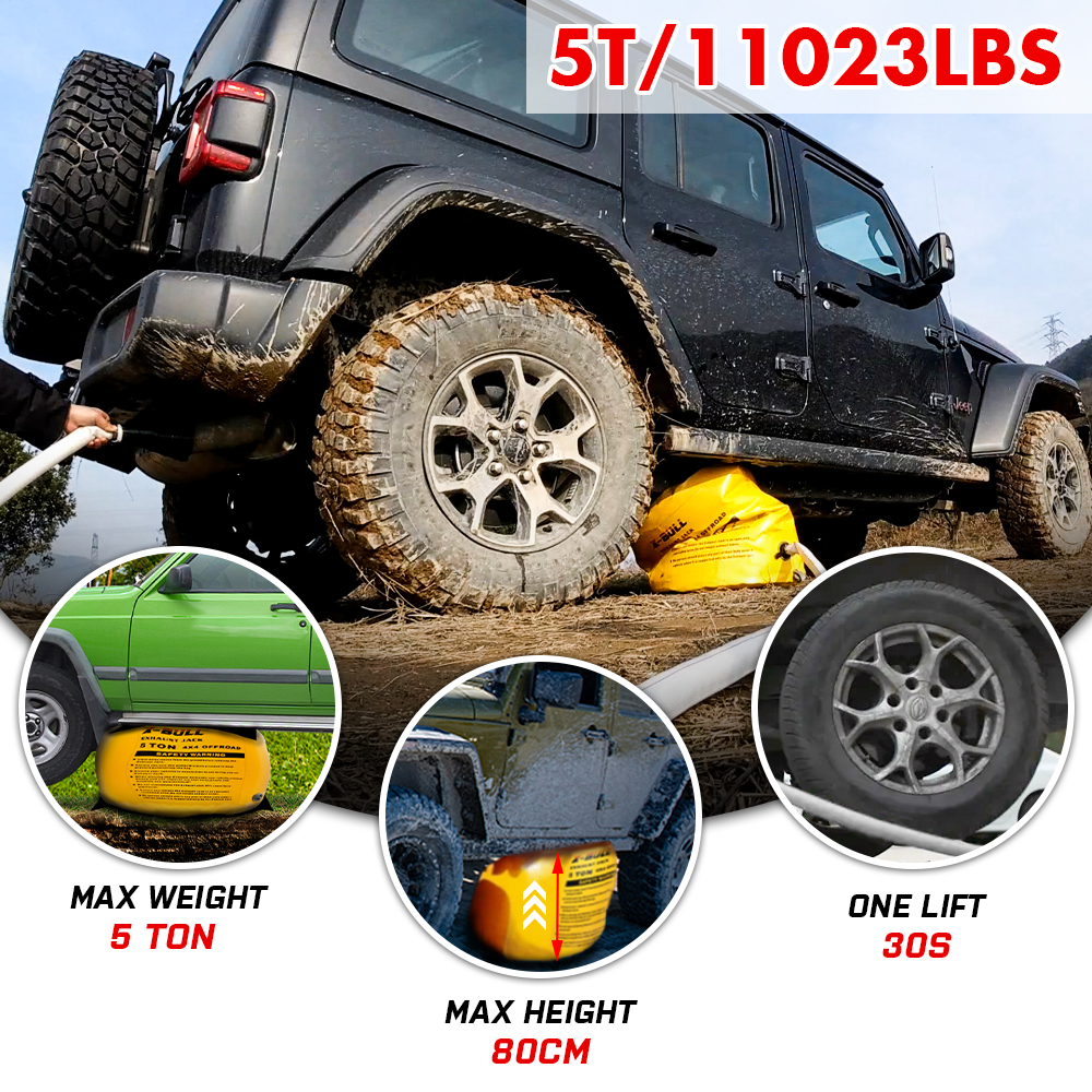 This product is a versatile recovery and air lifting kit designed for off-road and emergency situations. It features a high-capacity air jack that can lift vehicles weighing up to 5 tons, making it suitable for most cars, trucks, and heavy-duty vehicles. The kit includes essential accessories to ensure safe and efficient operation across various terrains.