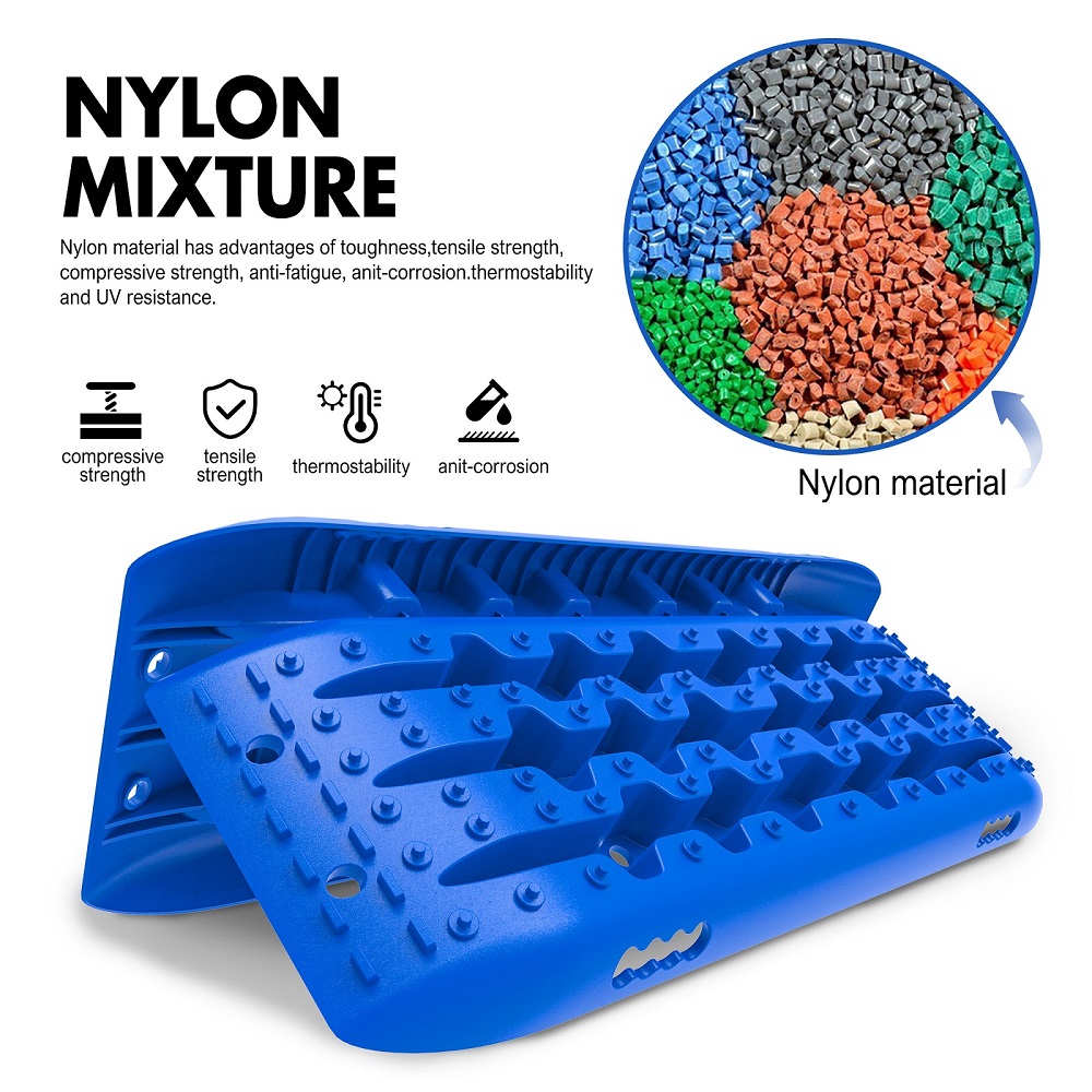 This product includes a set of recovery tracks designed for off-road vehicles. The tracks are made from durable nylon material and feature a unique U-shape and cruciform design to enhance stability and ground grip. They are suitable for use in sand, snow, and mud, supporting vehicles up to 10 tons. The package contains two pairs of tracks and stickers for easy identification and use.