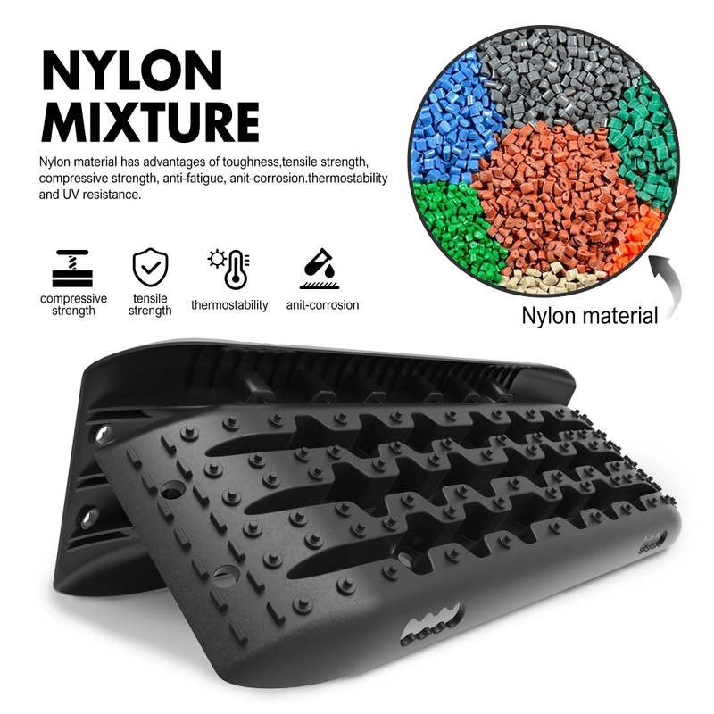 This product includes recovery tracks designed for off-road use, providing reliable traction in challenging terrains. The set features mounting pins for secure installation and durable leashes for easy handling. Made from reinforced nylon, these recovery tracks are built to withstand tough conditions and accommodate vehicles up to 10 tons. The multifunctional design allows them to be used as shovels, and the anti-UV coating ensures long-lasting performance.