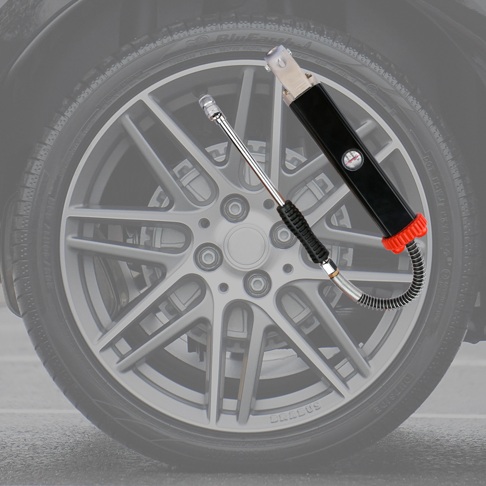 This tire inflator features a heavy-duty aluminium die-cast body and a precise pressure gauge, making it suitable for various vehicles including cars, motorbikes, and bicycles. It helps maintain optimal tire pressure, reducing wear and the risk of punctures, ensuring safer and more efficient driving.