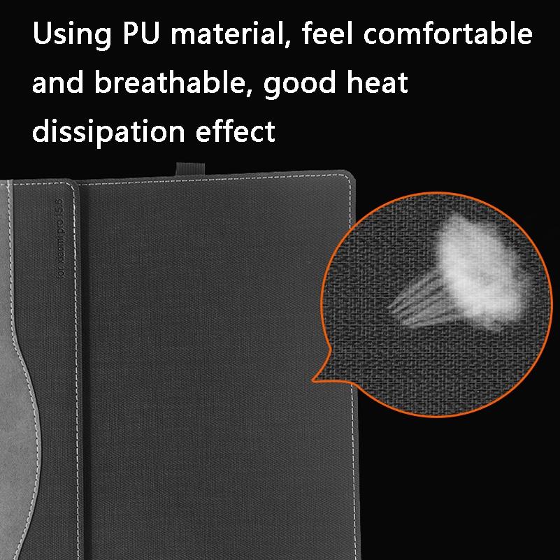 This protective laptop case is designed to safeguard and store laptops with a focus on durability and convenience. Made from high-quality PU leather and microfiber, it offers a comfortable, breathable feel with effective heat dissipation features. The case includes a magnetic bracket for easy use and a protective edge that extends beyond the laptop to prevent wear and tear. Its exterior is non-slip and sweat-absorbing, providing a comfortable grip and added protection.