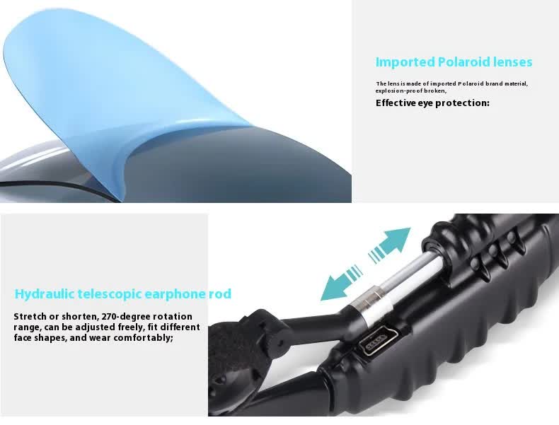 Key features include Bluetooth 4.1 for reliable connection, polarized lenses with anti-glare protection, open-ear audio for awareness of your environment, adjustable earbuds with 270-degree rotation, and a lightweight design weighing only 35 grams.