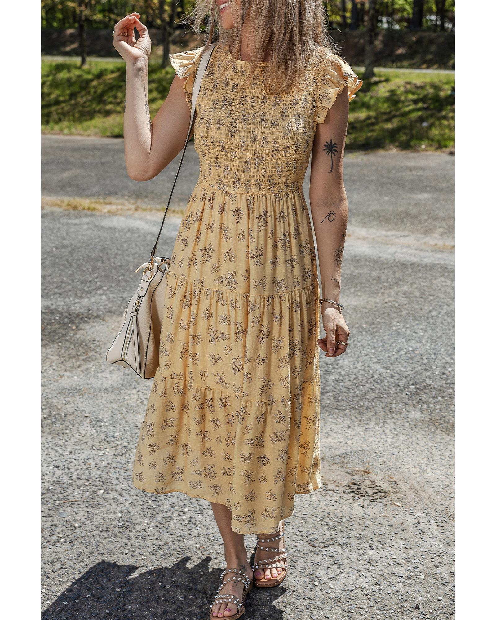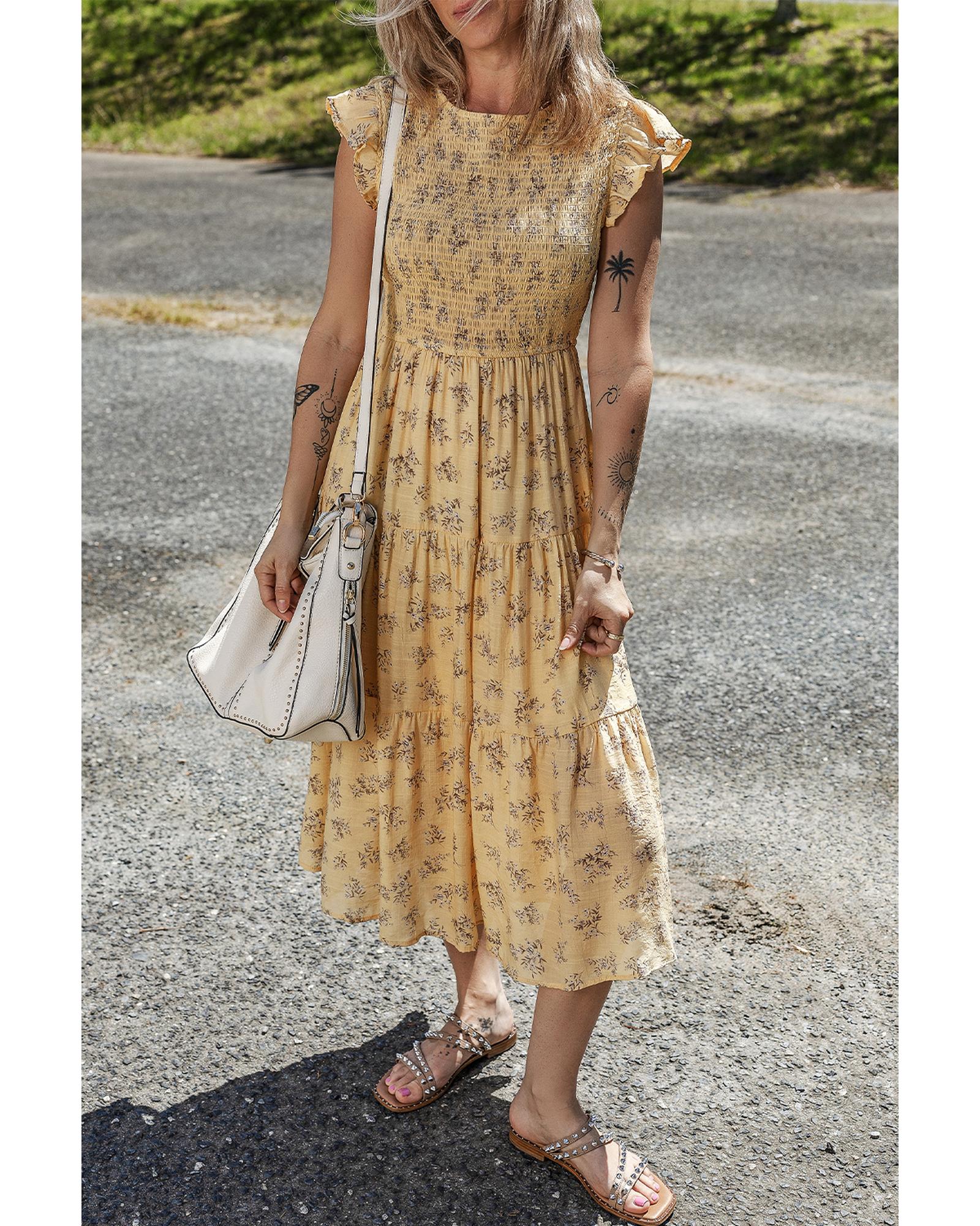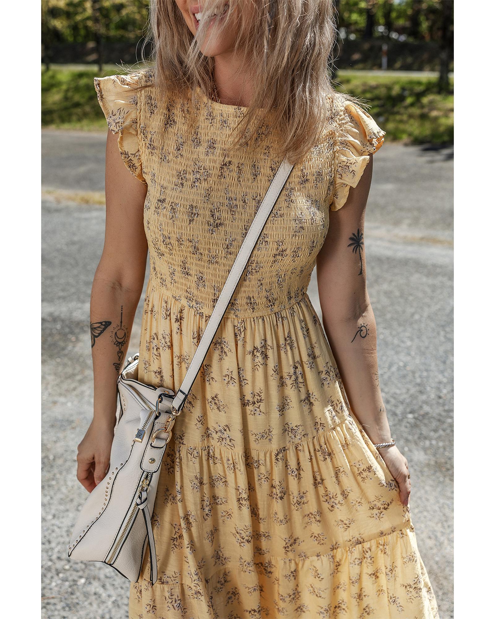 This summer dress features a bohemian floral print and a flowy silhouette, perfect for warm weather. The smocked design ensures a comfortable and flattering fit, while the delicate flutter sleeves add a romantic touch. The high waist accentuates your figure, making it a stylish choice for casual or special occasions.