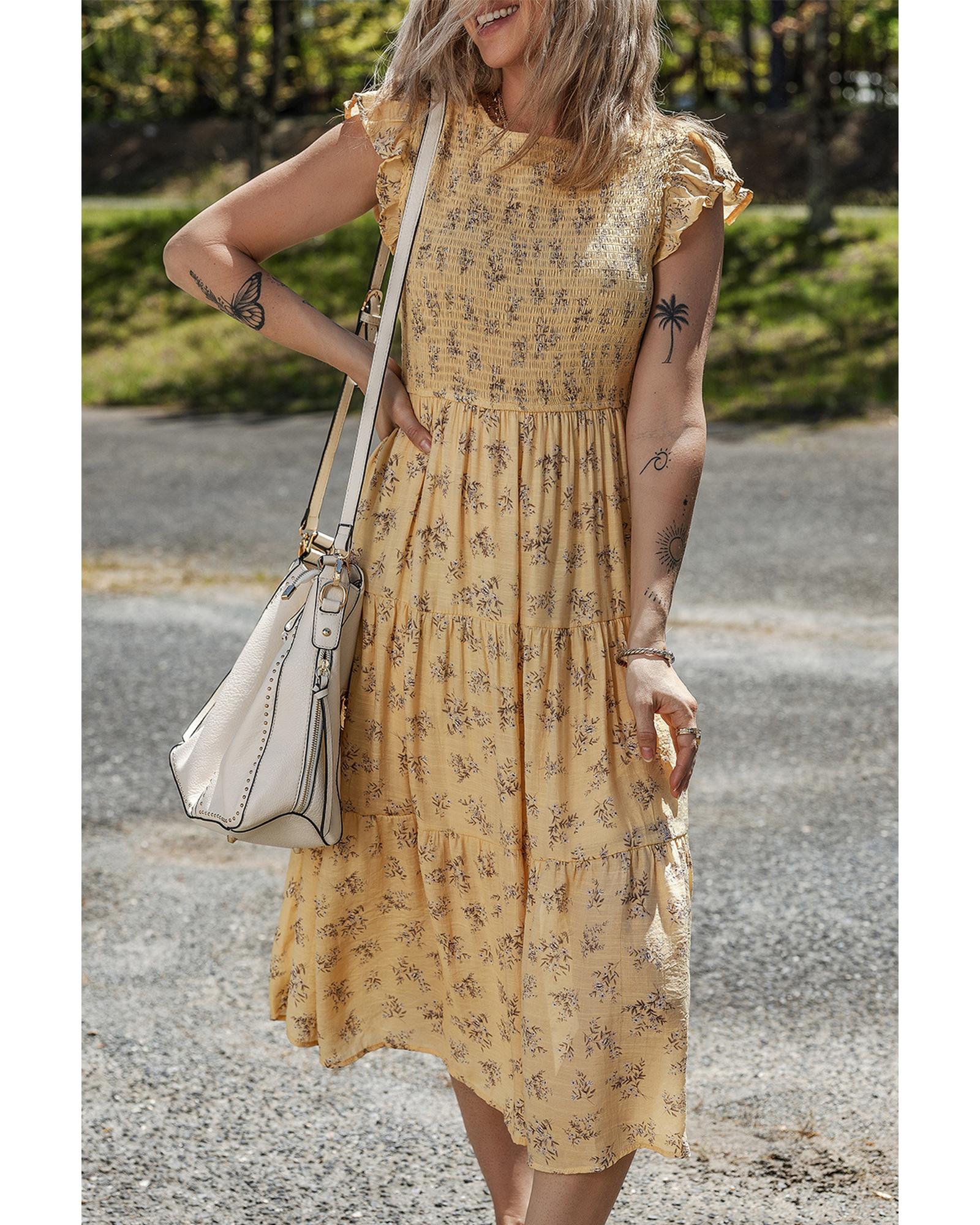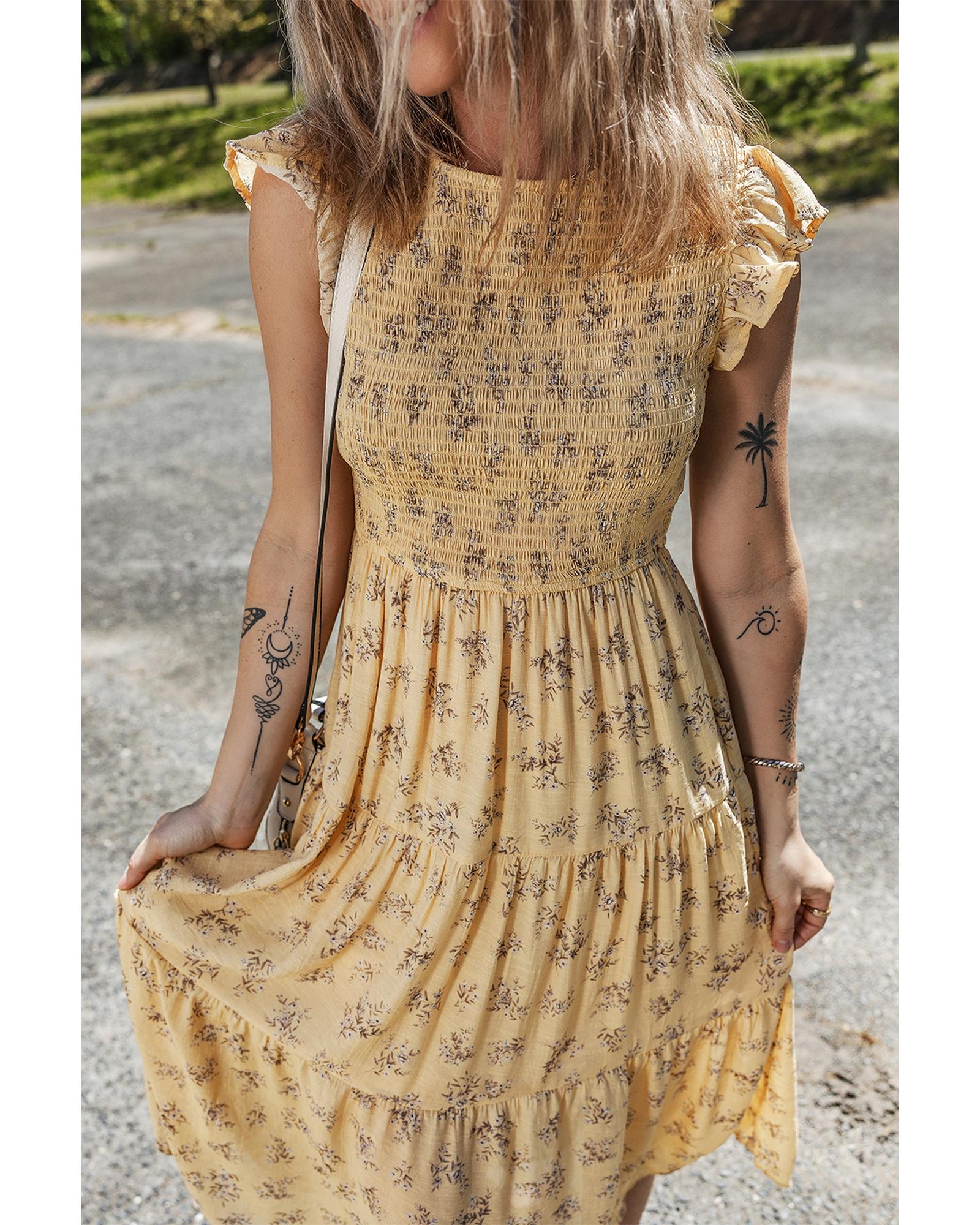 This summer dress features a bohemian floral print and a flowy silhouette, perfect for warm weather. The smocked design ensures a comfortable and flattering fit, while delicate flutter sleeves add a romantic touch. The high waist design helps to define your silhouette, making it a stylish choice for casual or semi-formal occasions.