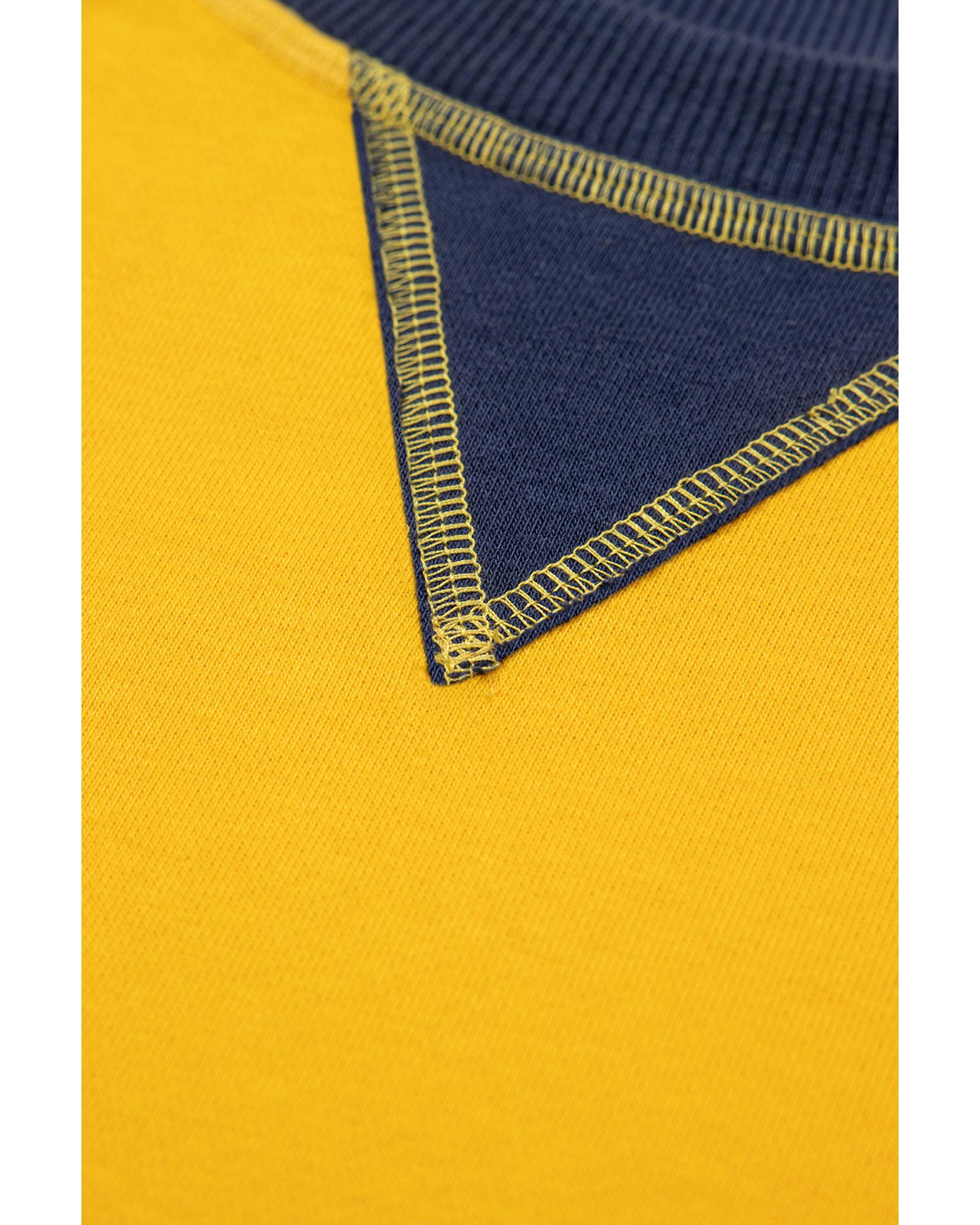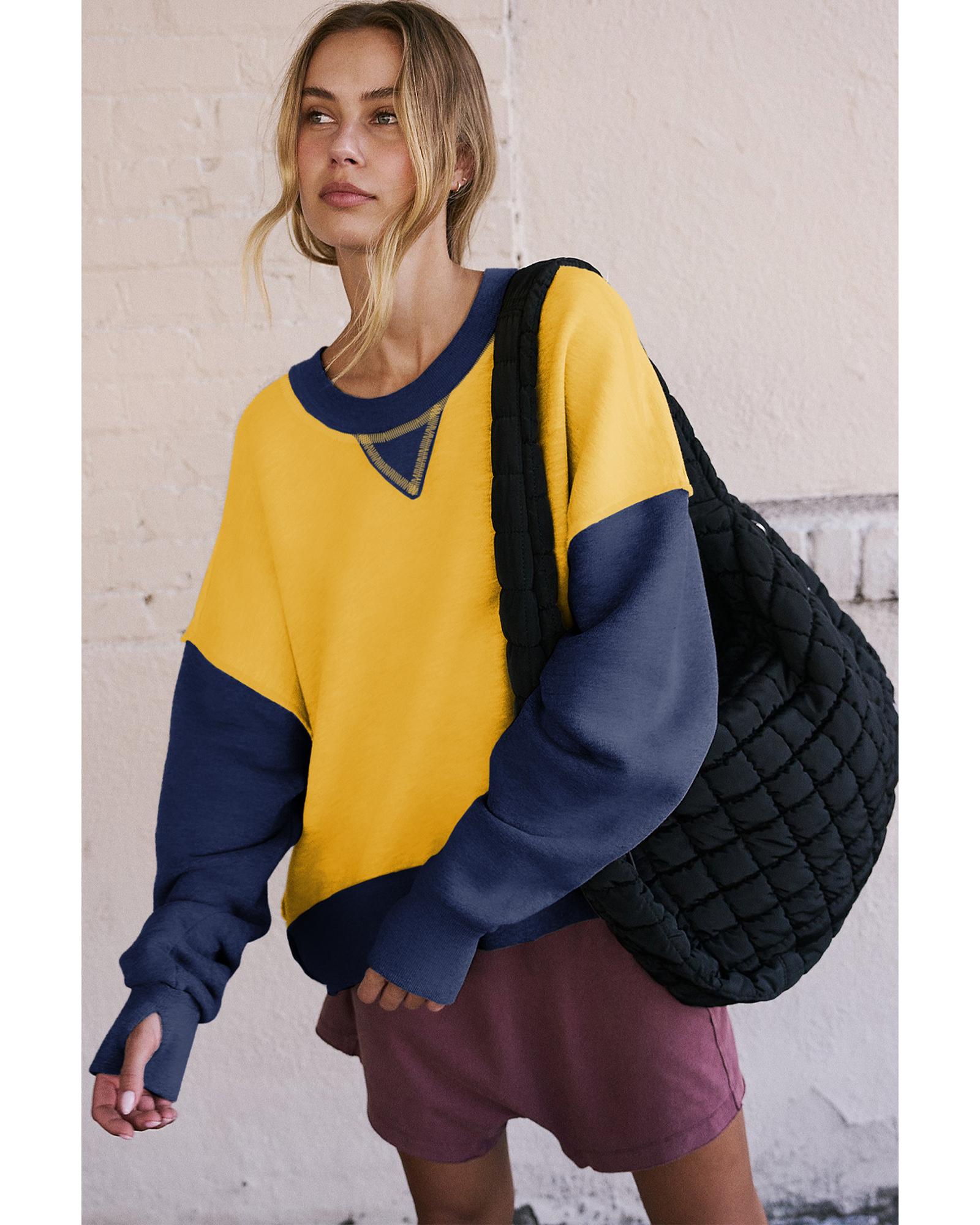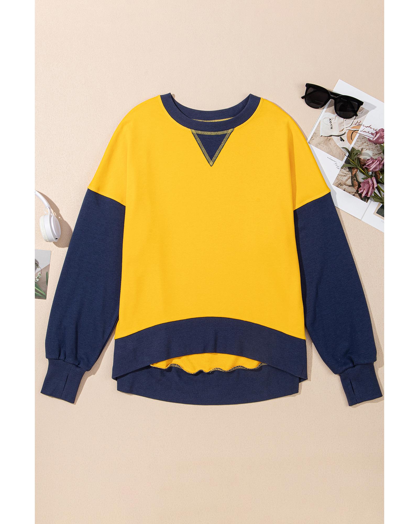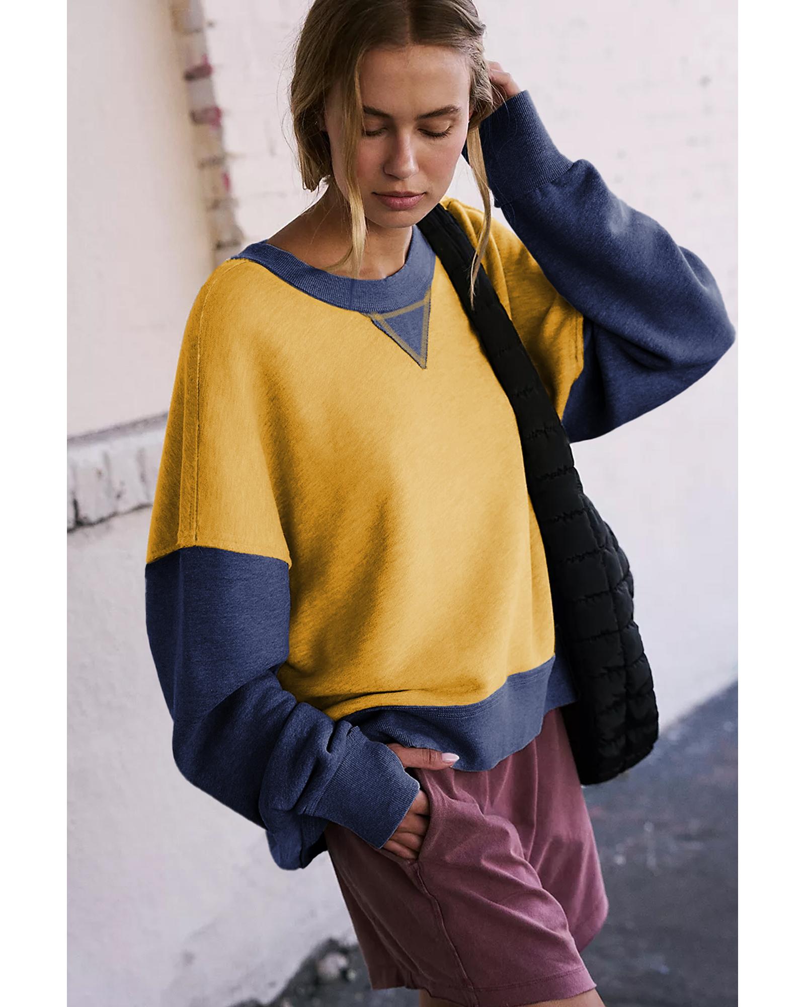 This yellow color block sweatshirt features a trendy and relaxed design, perfect for casual wear. It combines comfort with style through its unique color blocking and drop shoulder silhouette, making it a versatile addition to any wardrobe.
