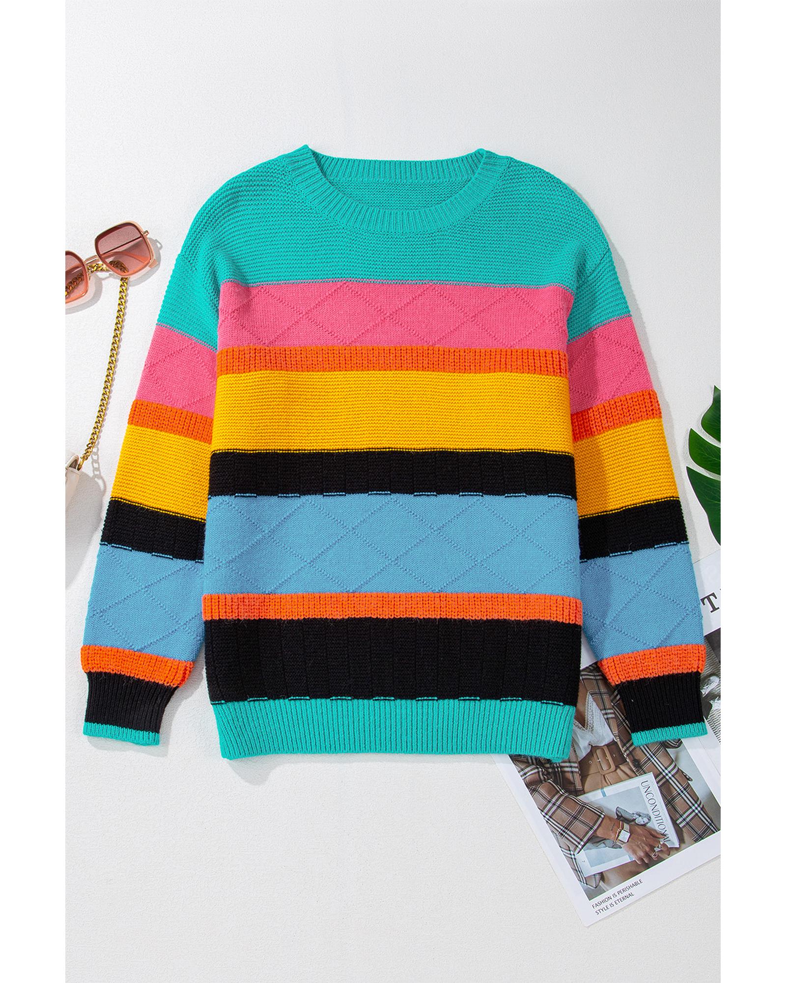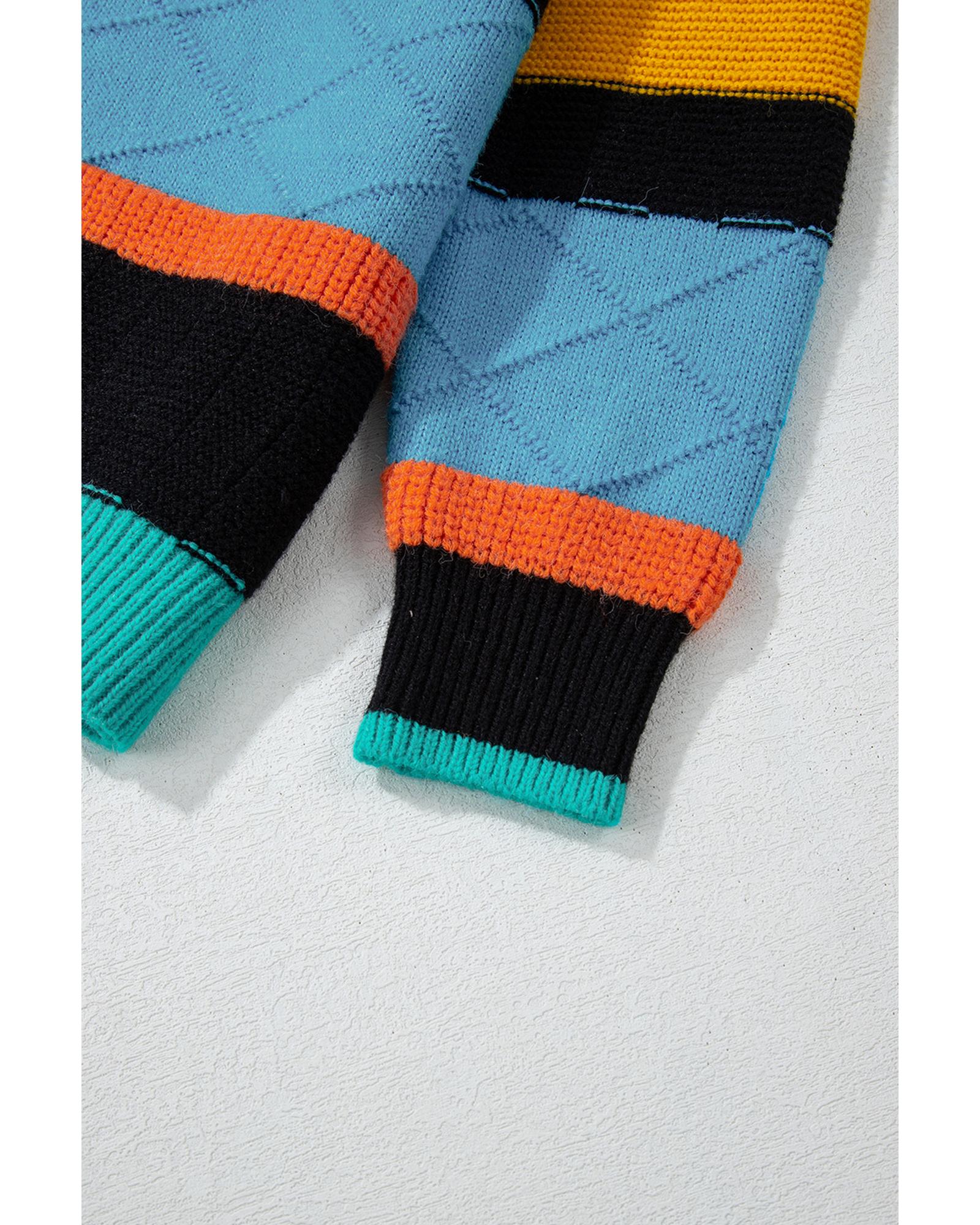 This yellow colorblock sweater features a mixed textured design with a drop shoulder style, offering a trendy and casual look. Made from soft, warm material, it is ideal for staying cozy during colder weather and perfect for layering in winter. Its bold color block pattern and textured details make it a fashionable choice for various occasions.
