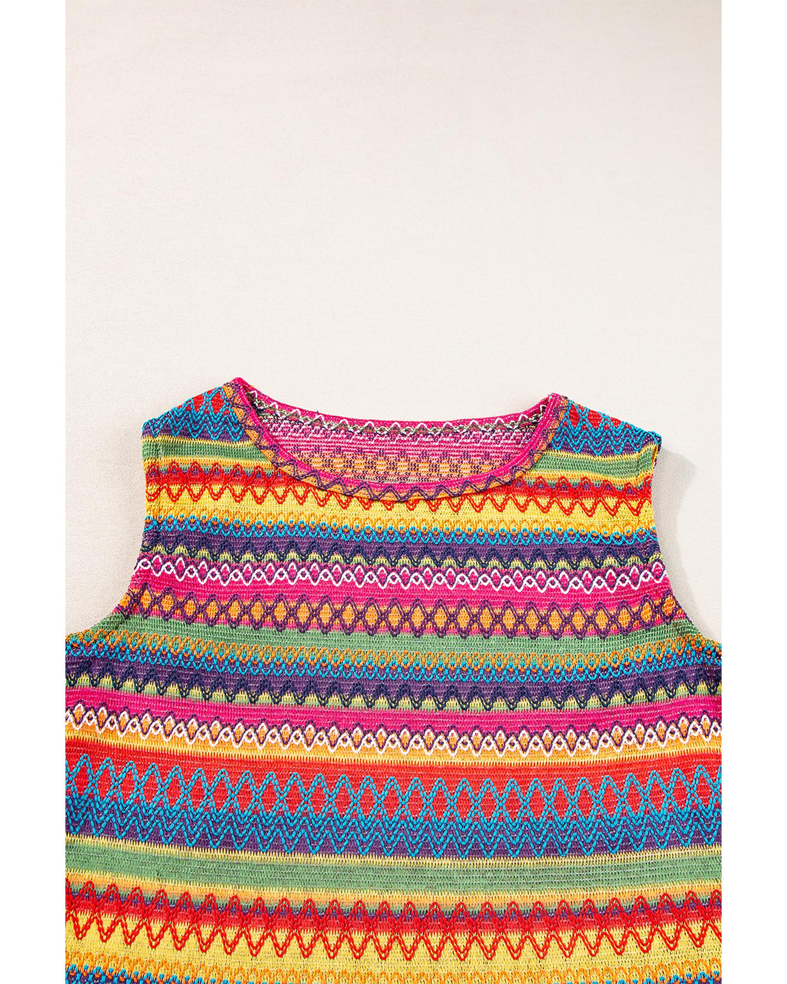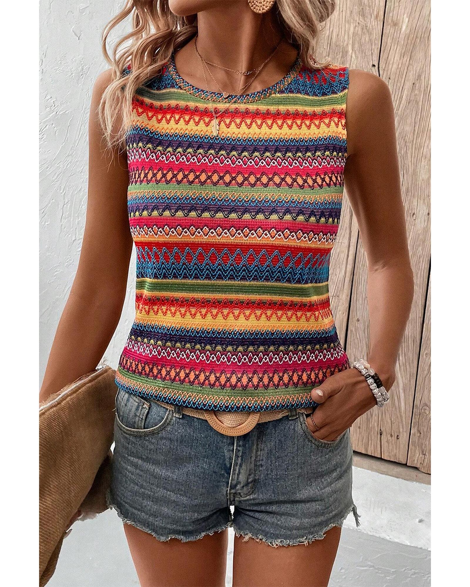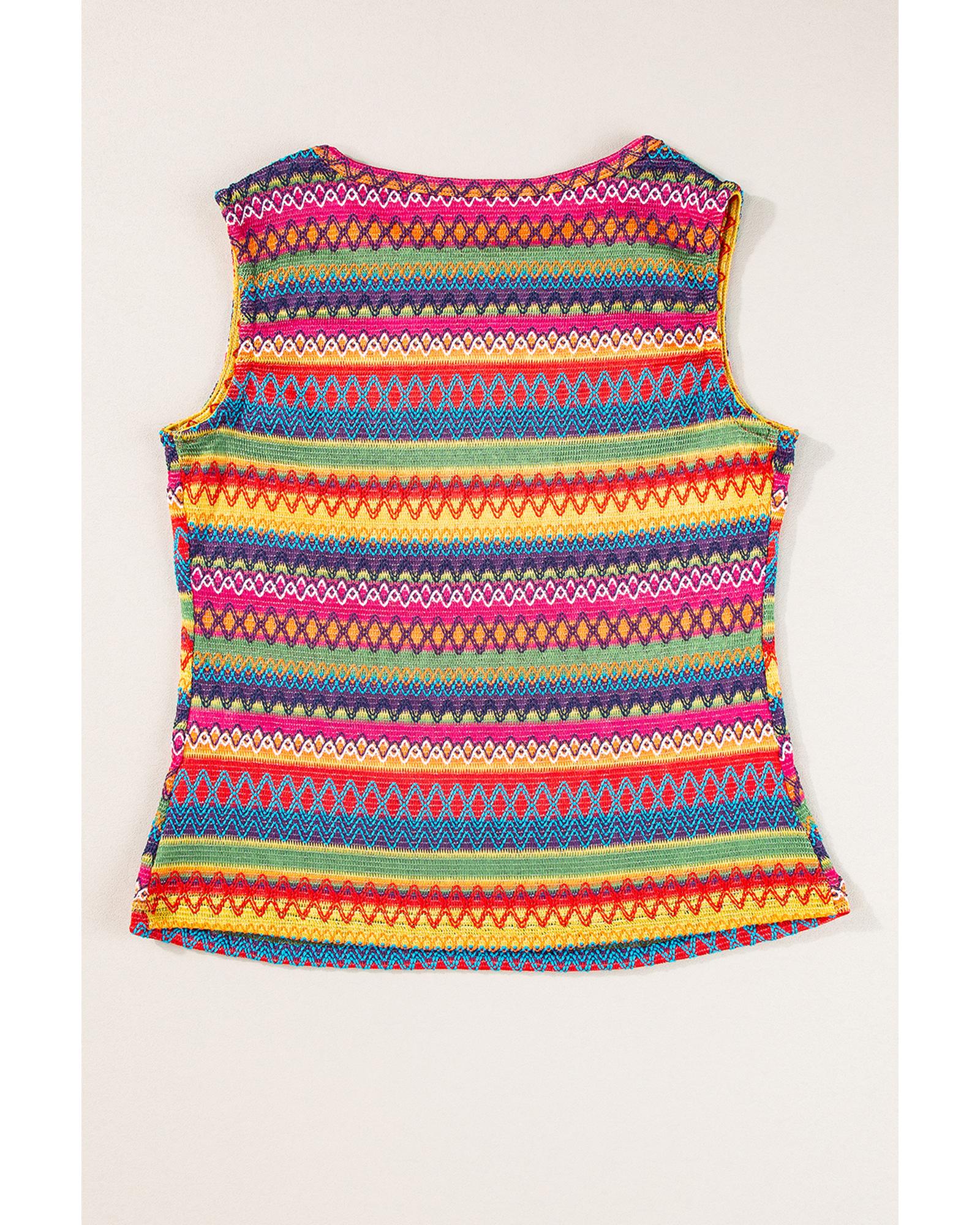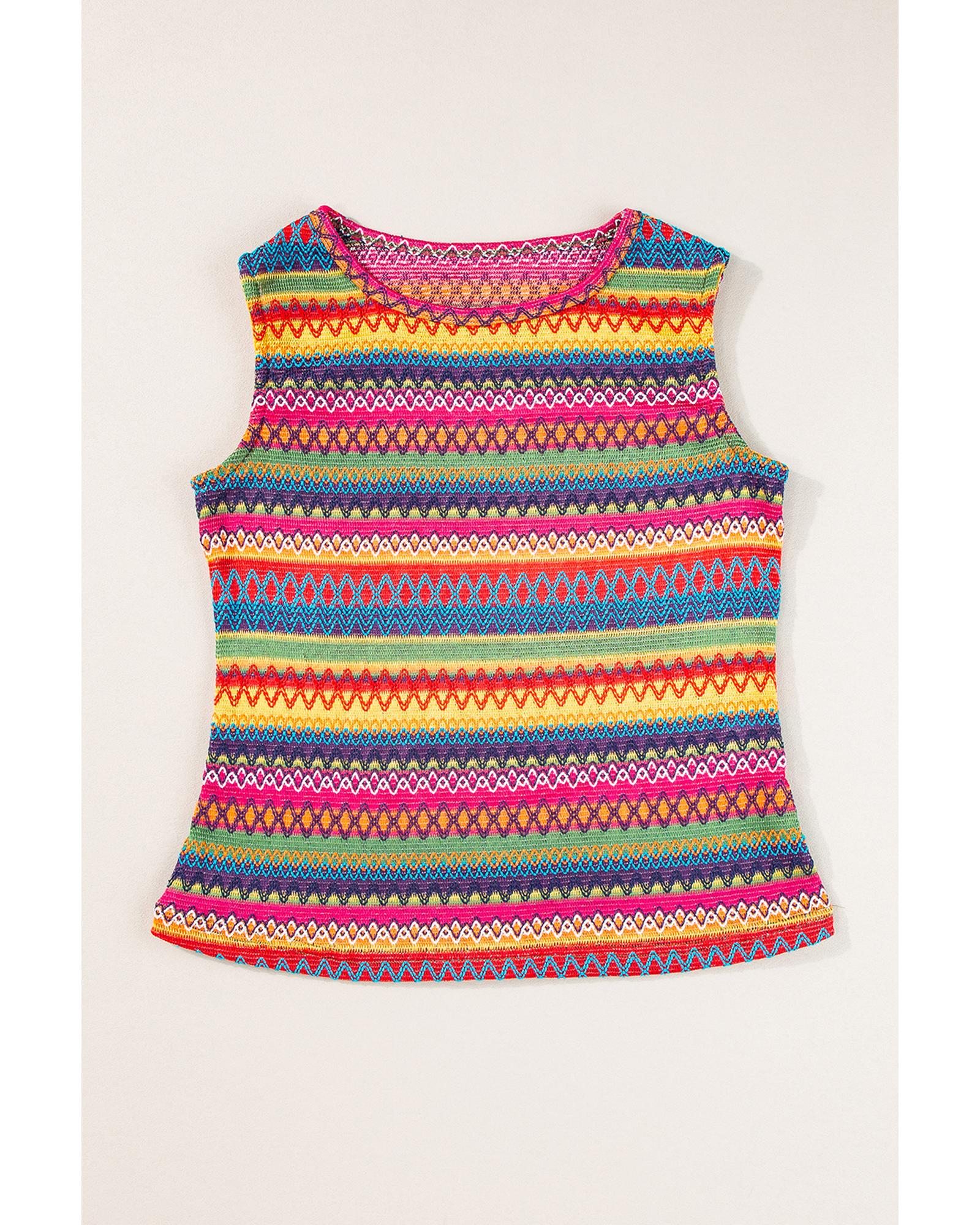 This sleeveless top features a vibrant yellow color with an ethnic wavy pattern, designed for a trendy and stylish look. It offers a comfortable fit with a round neckline and is ideal for warm weather. The versatile design makes it easy to pair with various bottoms for different occasions.