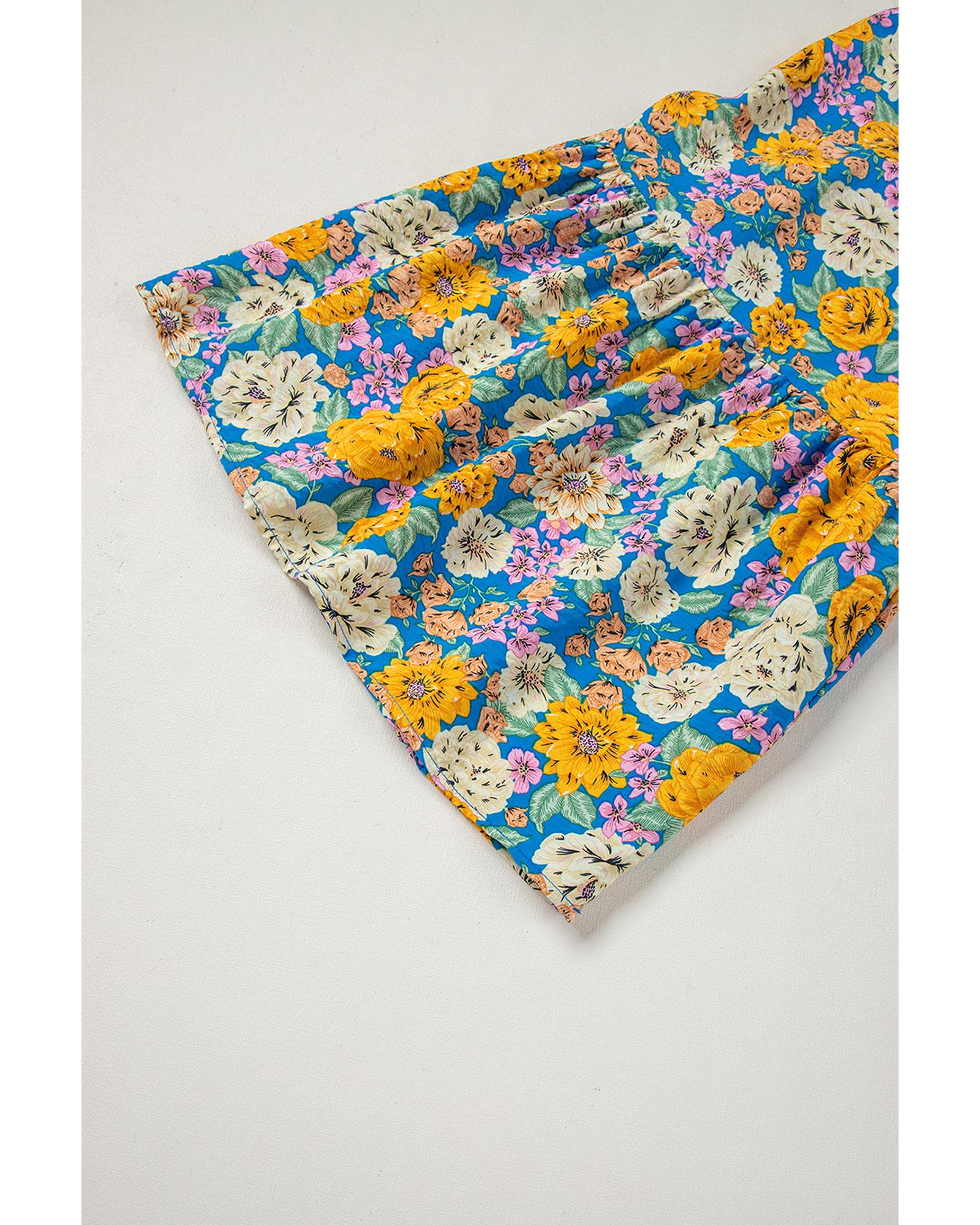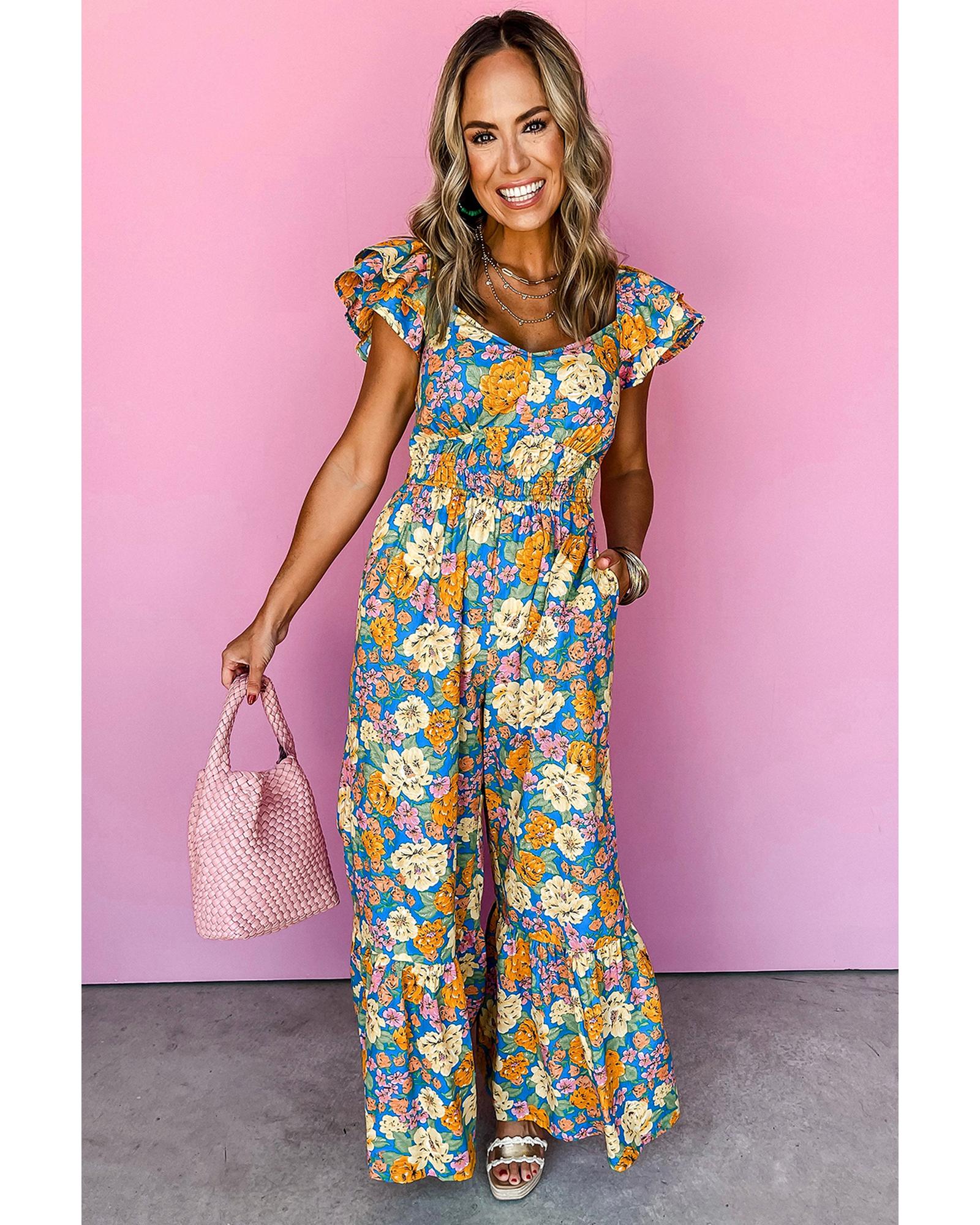 This yellow floral allover print jumpsuit features a high waist design with a shirred cut-out detail, offering a stylish and flattering silhouette. The elegant ruffled sleeves and wide-leg cut add a touch of sophistication, making it suitable for various occasions.