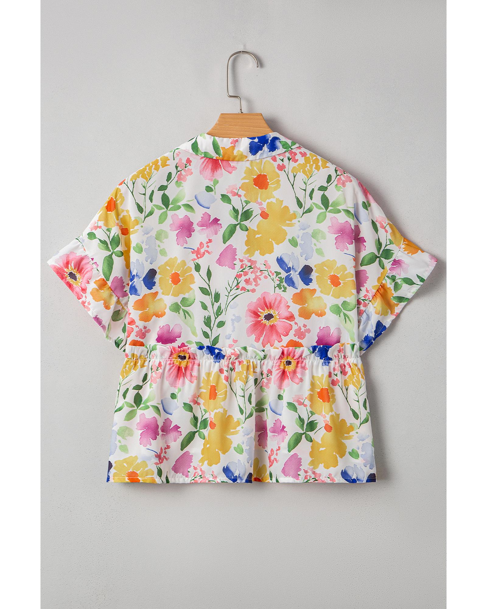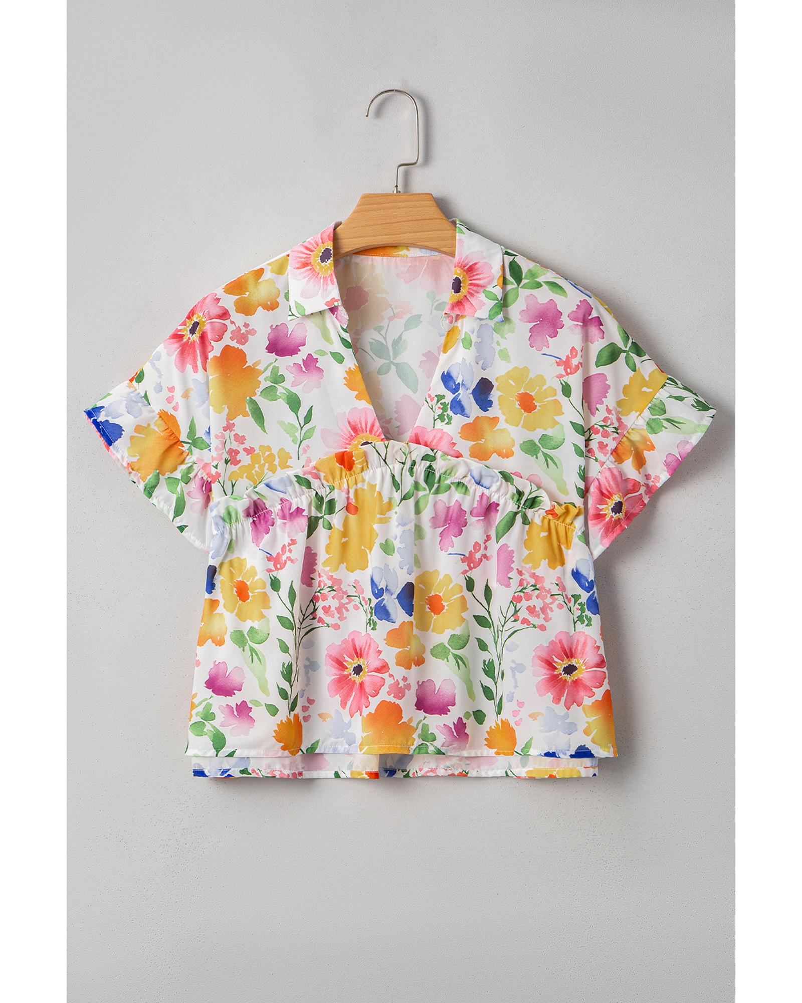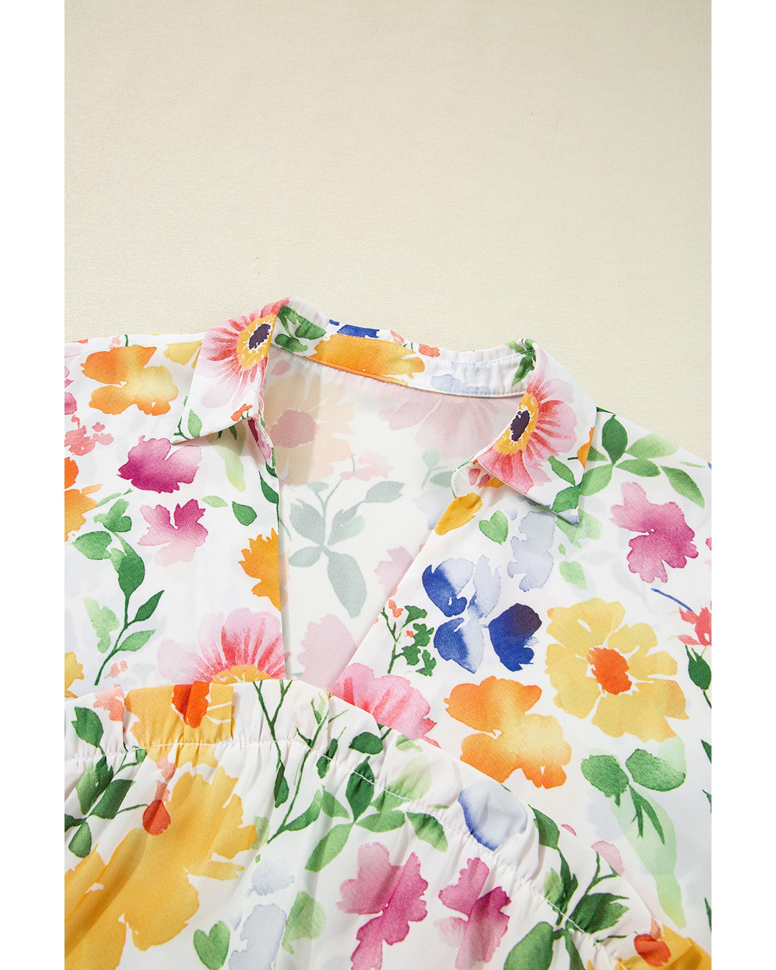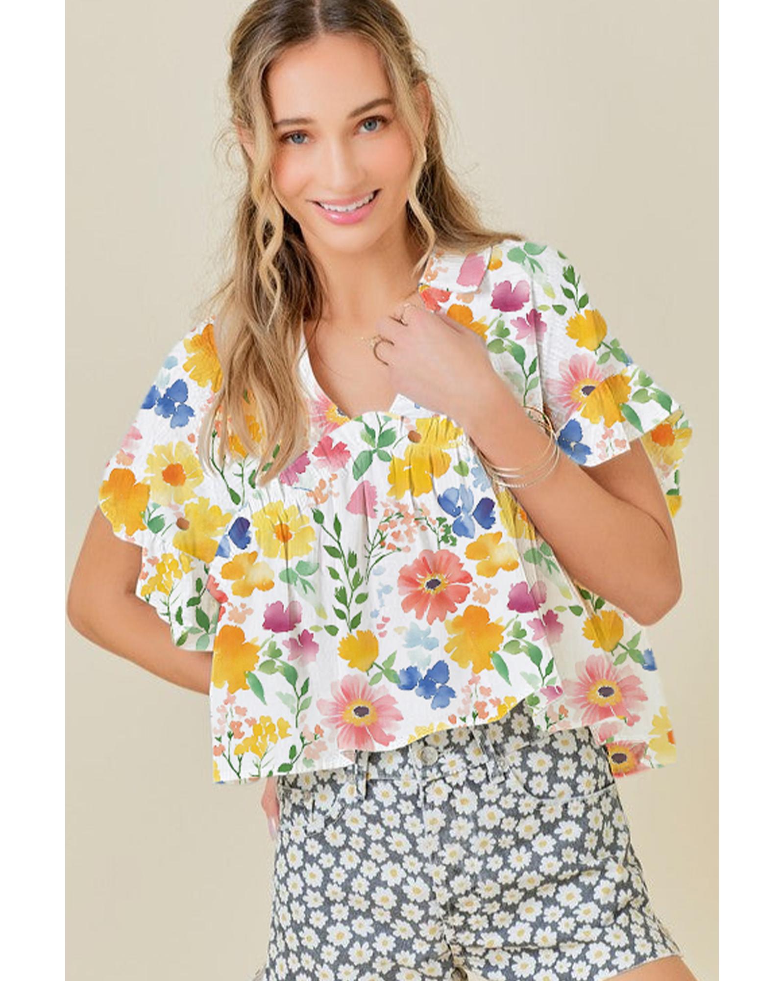This yellow floral blouse features a boxy fit with a cropped silhouette, offering a stylish and comfortable look. The V-neck design and ruffled short sleeves add feminine details, making it suitable for various occasions. Crafted from high-quality polyester, it provides a loose fit that flatters different body shapes.