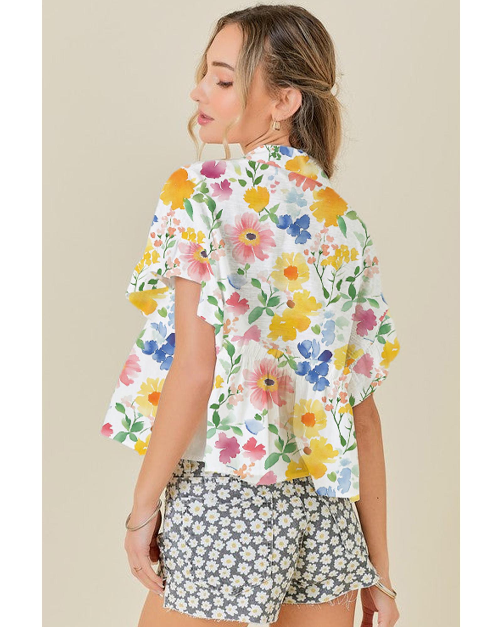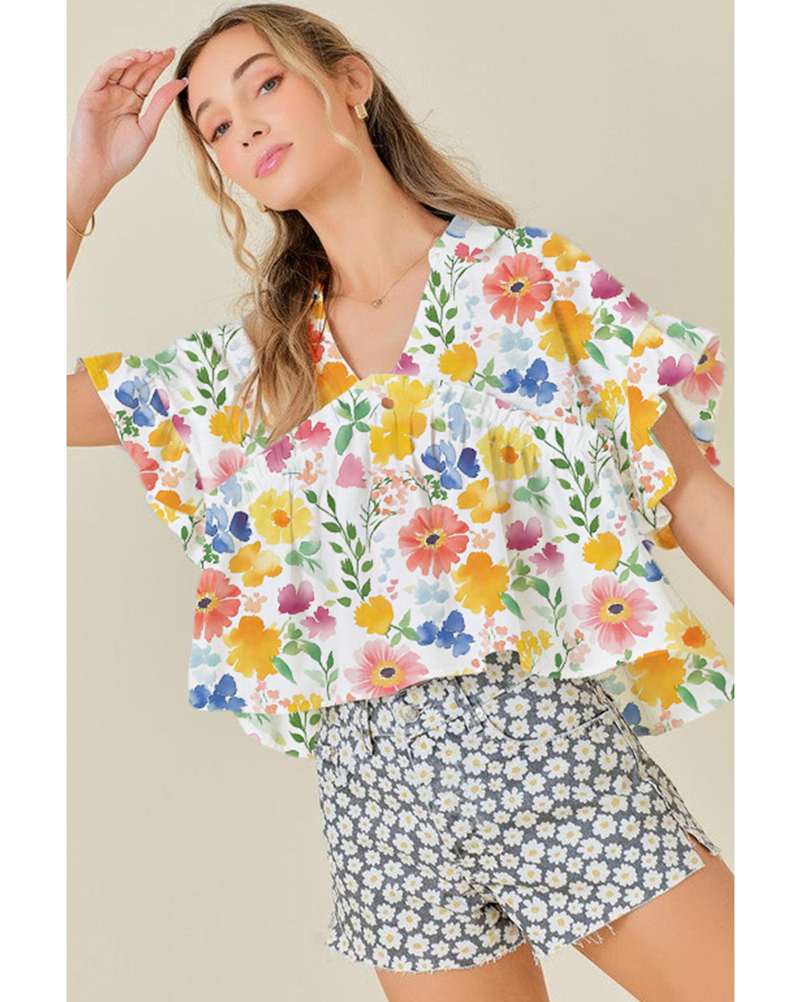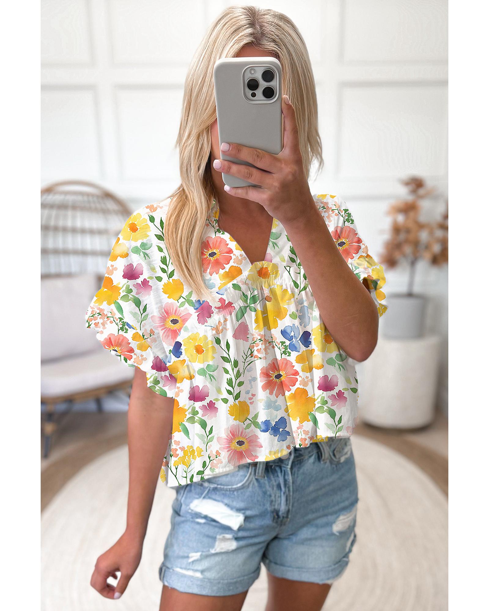 This yellow floral blouse features a boxy fit with a cropped silhouette, offering a stylish and comfortable look. The V-neck design and ruffled short sleeves add feminine details, making it suitable for various occasions. Crafted from high-quality polyester, this loose-fitting blouse is designed to flatter different body shapes.