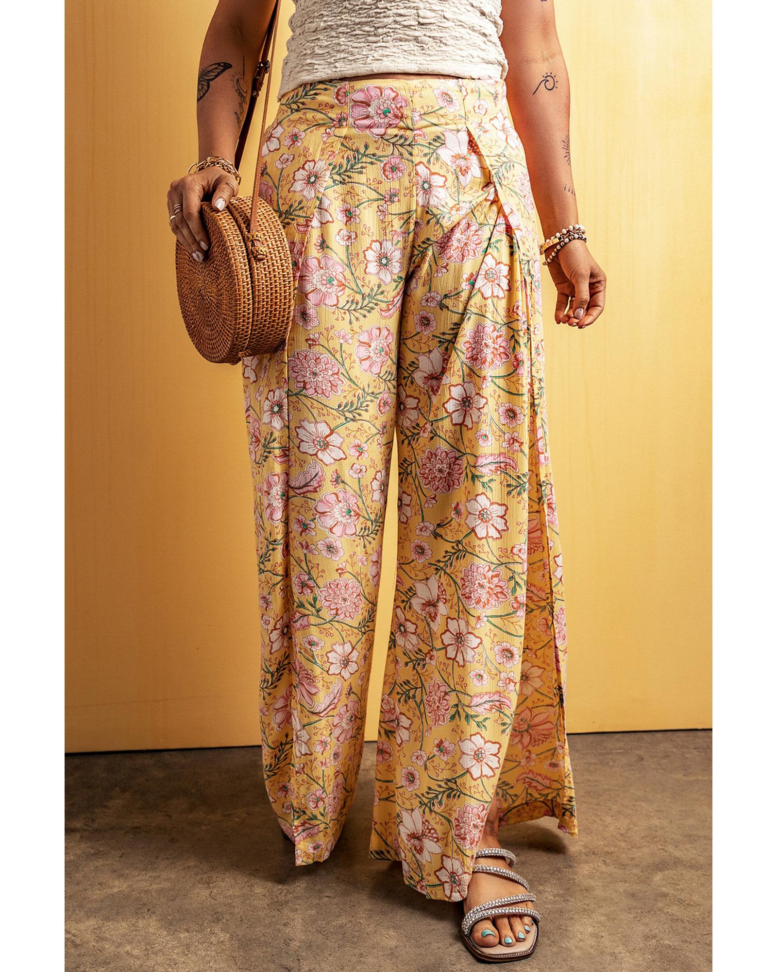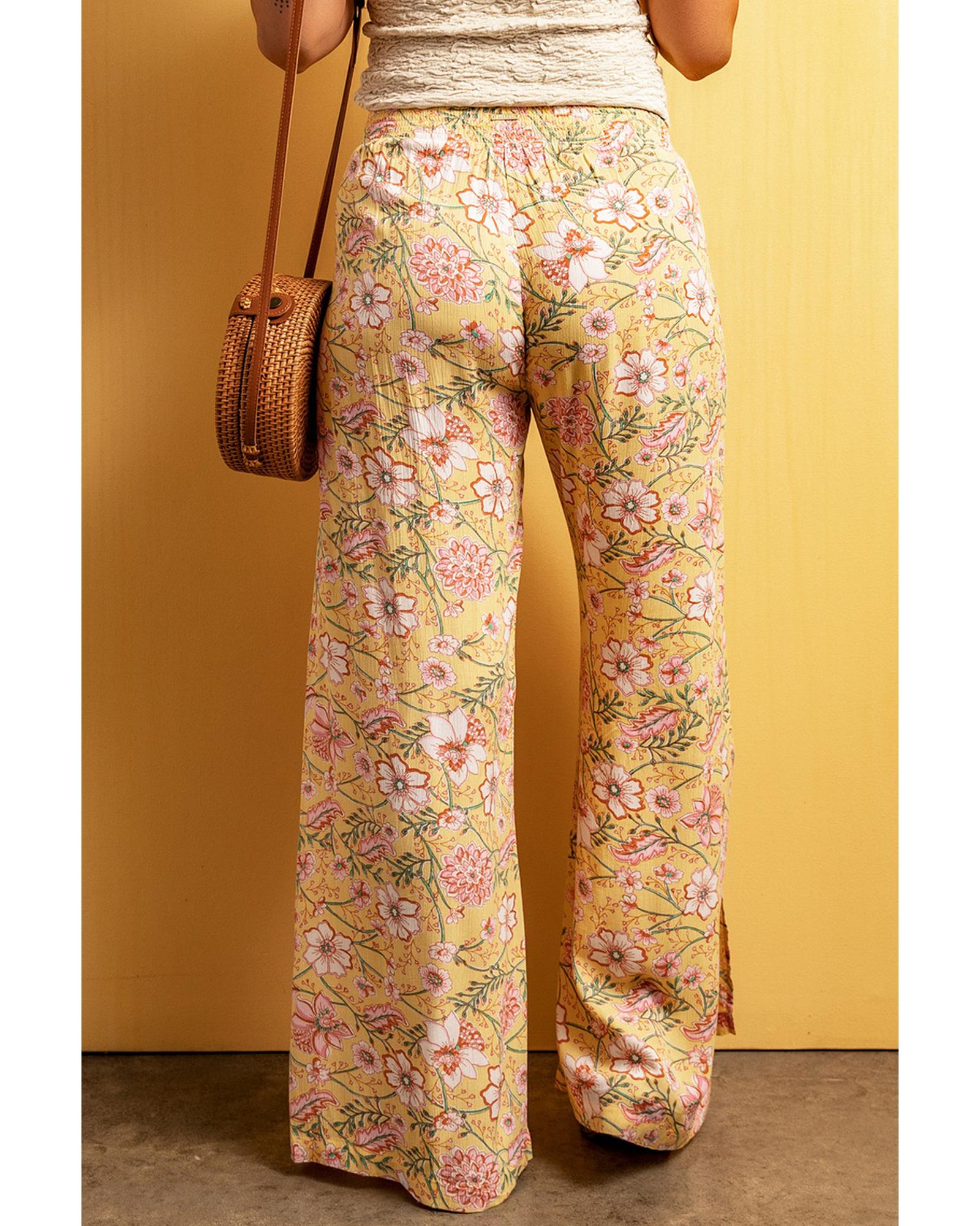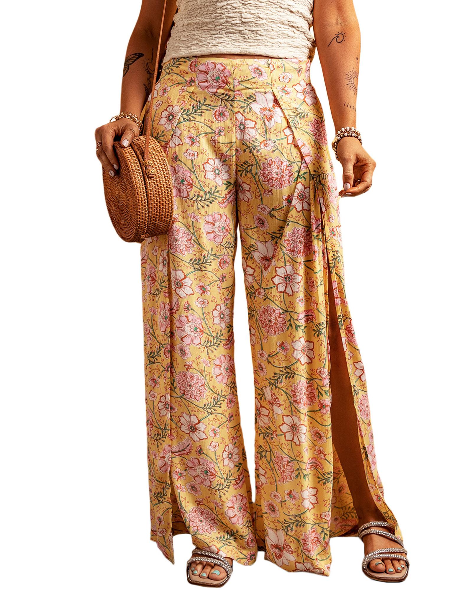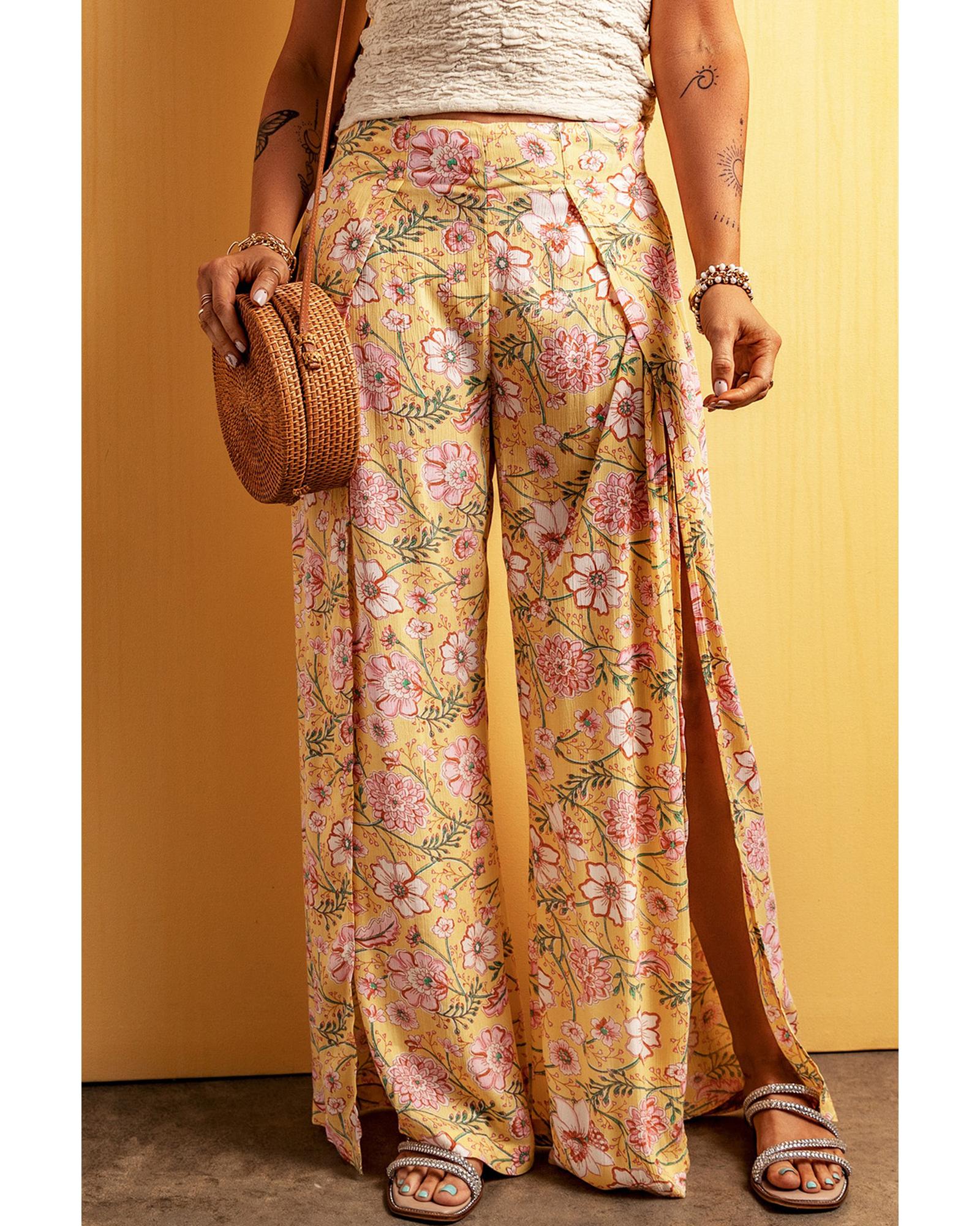 This pair of high slit wide leg pants features a vibrant yellow floral print, perfect for a bohemian style. Designed with a trendy fitted look, these pants are ideal for vacation and spring wear, offering a comfortable and fashionable option for various occasions.