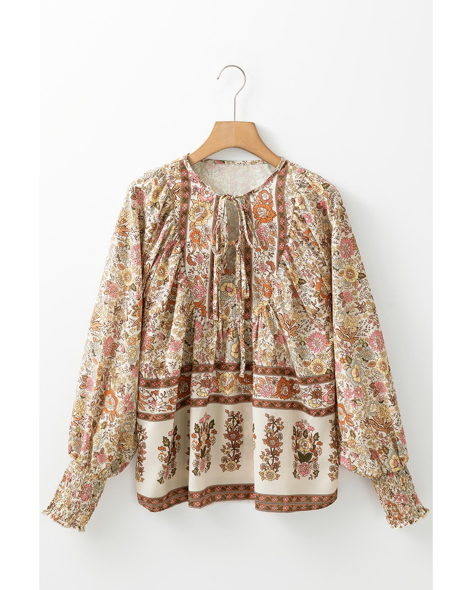 Yellow Floral Print Tie Neck Lantern Sleeve Blouse – S