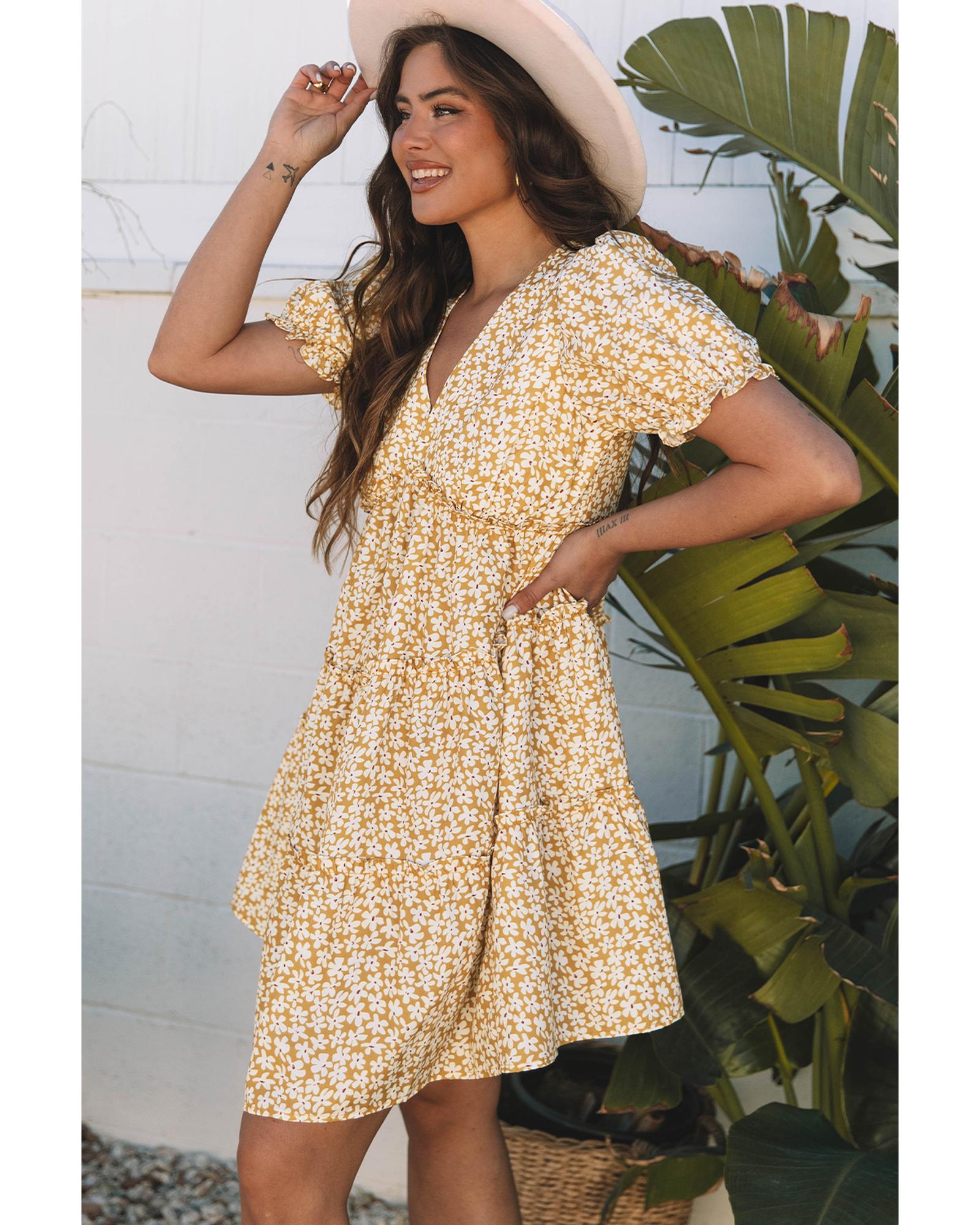 Package Content: 1 x Yellow Floral Short Sleeve V Neck Frilly Tiered Mini Dress