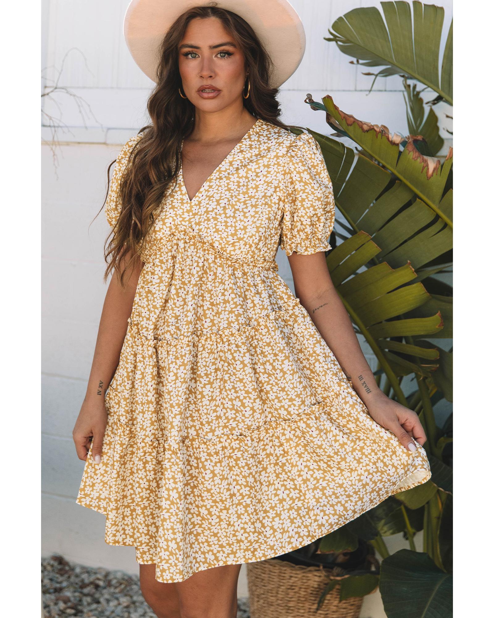 This yellow floral mini dress features a charming design with a V neckline and tiered frilly details. The puff sleeves add a playful and trendy touch, making it suitable for various occasions. Crafted from lightweight and breathable fabric, it offers all-day comfort.