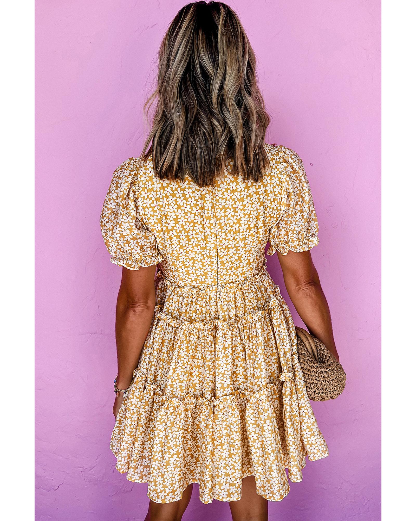 This yellow floral mini dress features a vibrant floral print and a flattering V neckline. Designed with tiered frilly details and puff sleeves, it offers a playful and trendy look. Made from lightweight and breathable fabric, it ensures comfort for all-day wear.
