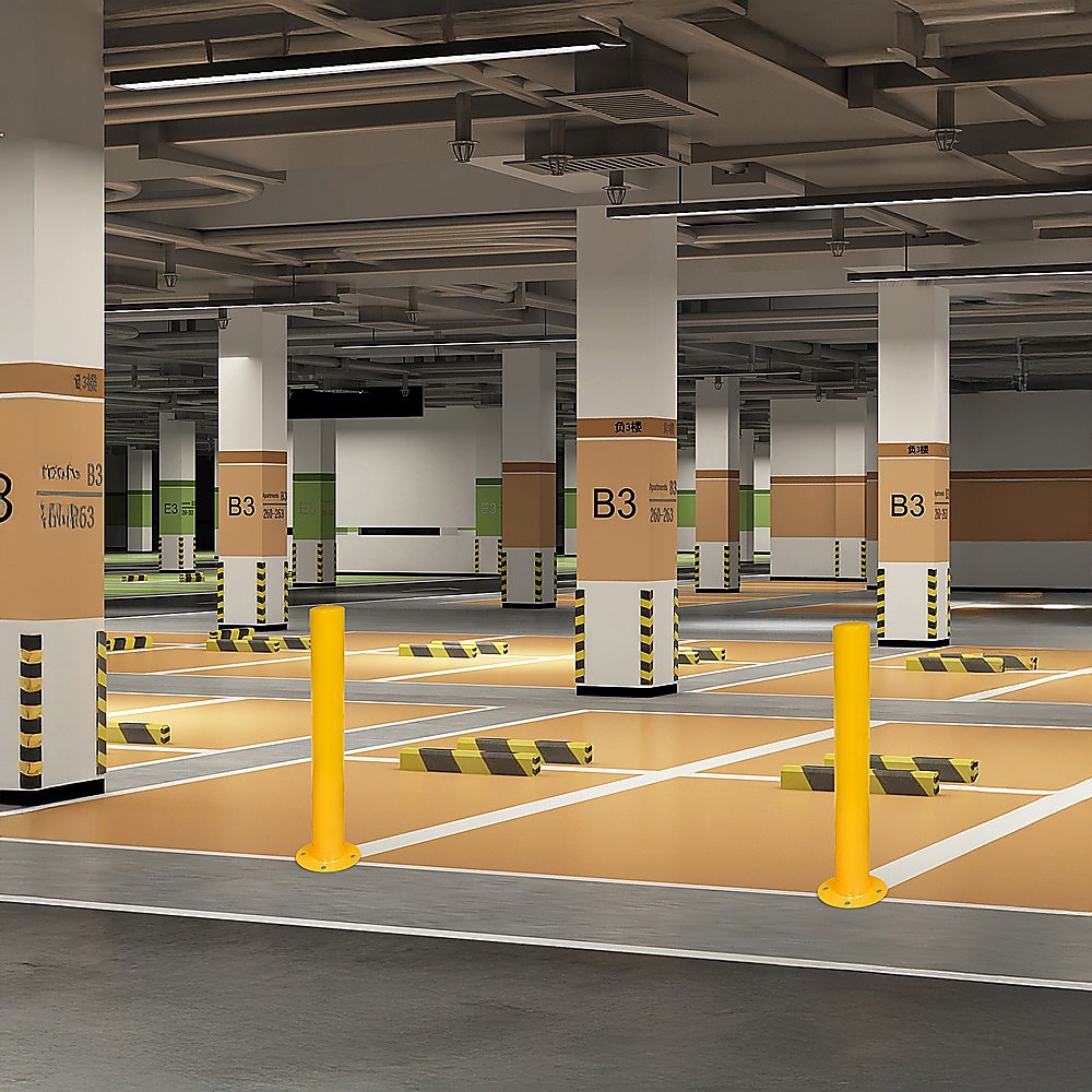 This heavy-duty steel bollard post is designed to provide effective protection for parking areas and storefronts. It features a durable galvanised construction with a solid round mounting base, ensuring stability and longevity in various environments.