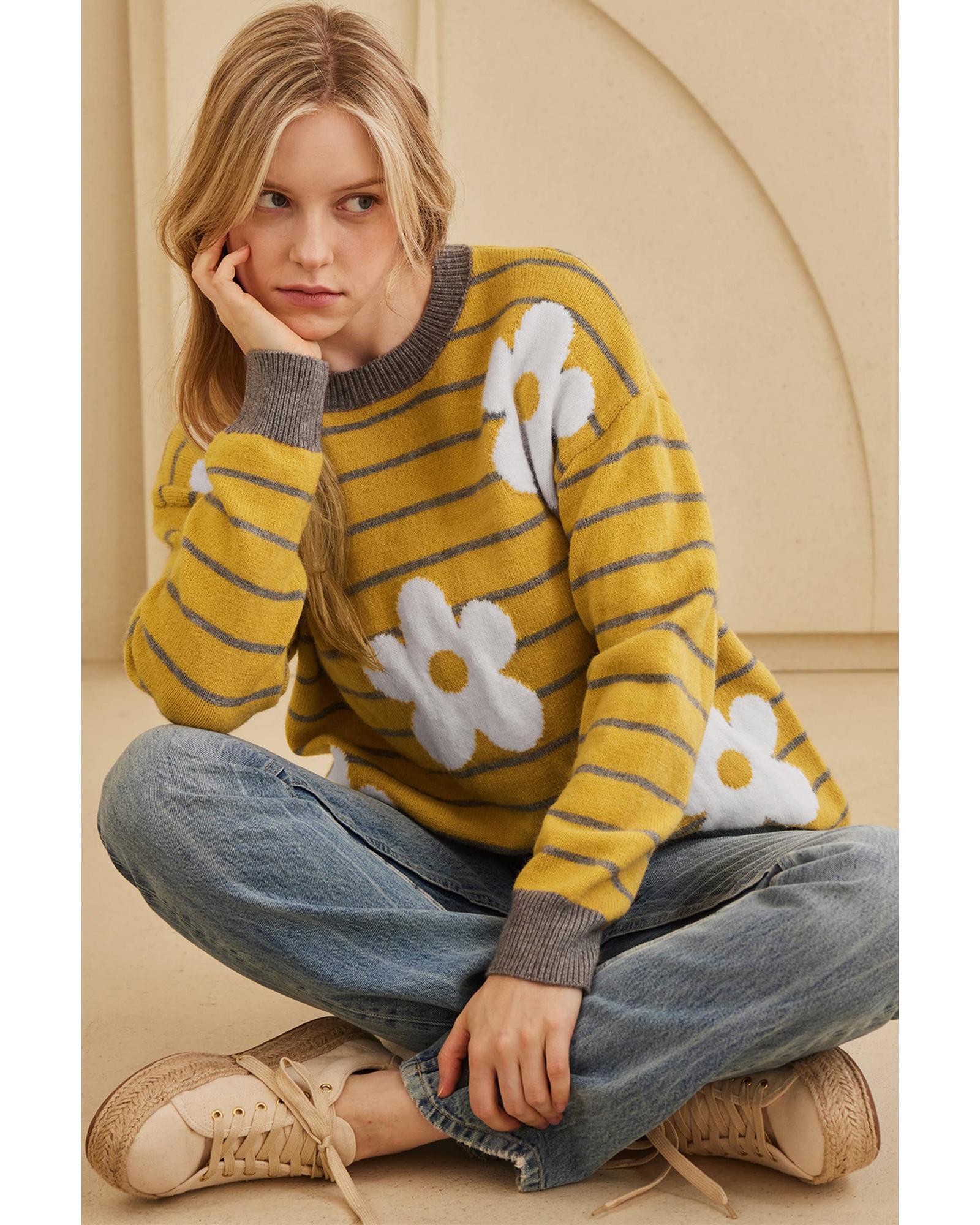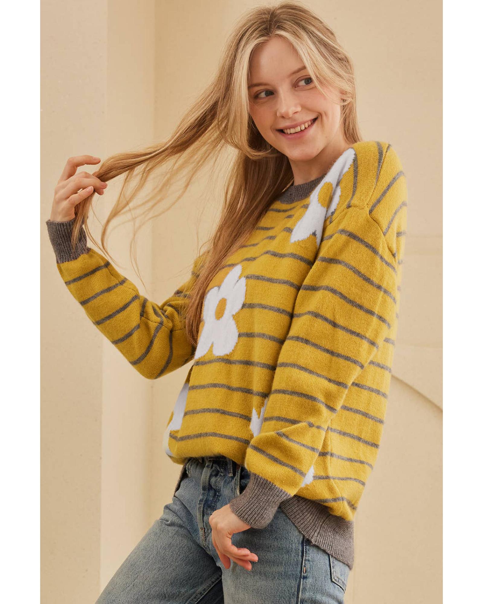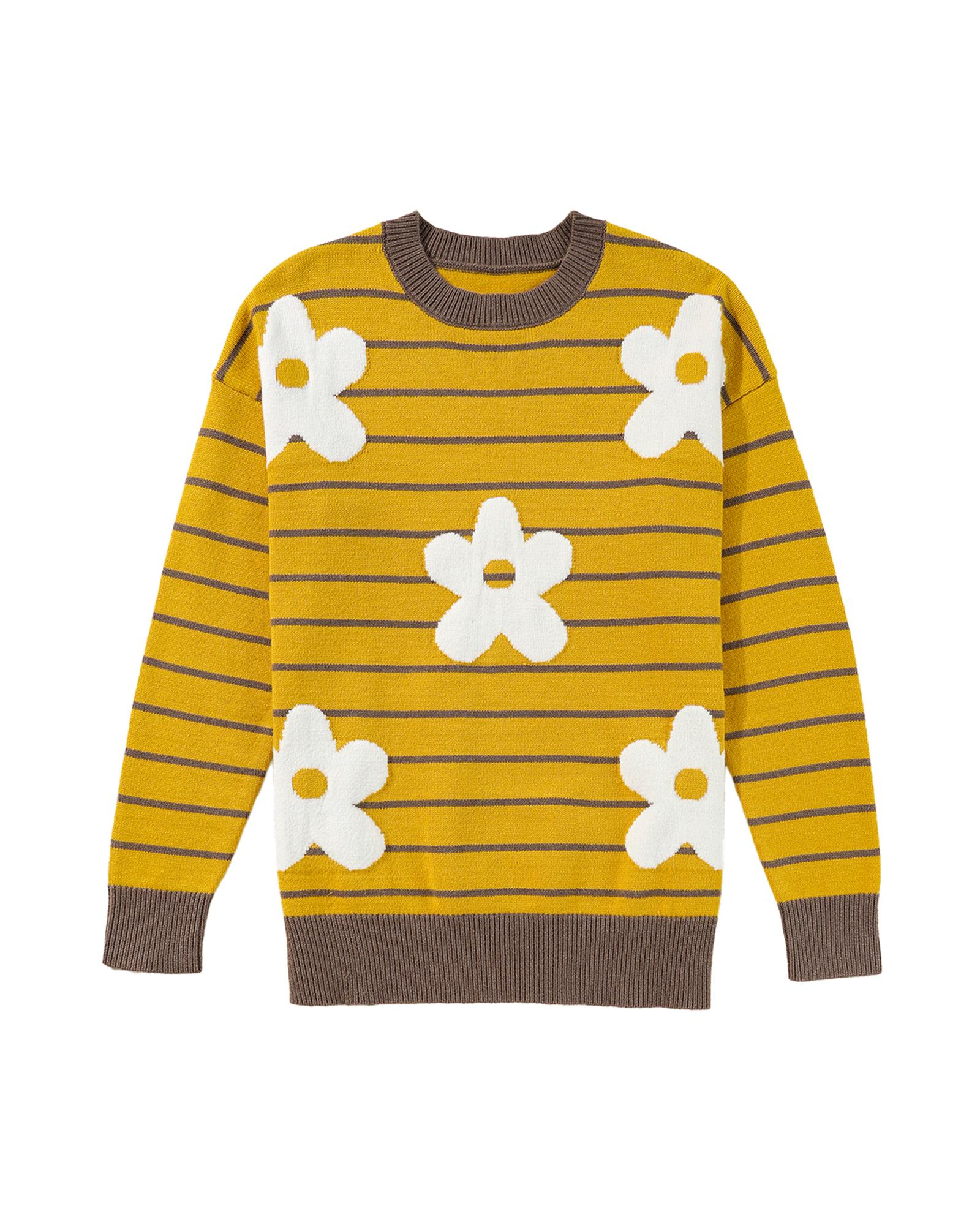 This yellow stripe daisy floral knitted sweater features a classic round neck design with a trendy fitted look. Its versatile style makes it suitable for pairing with jeans or skirts, perfect for cooler weather.