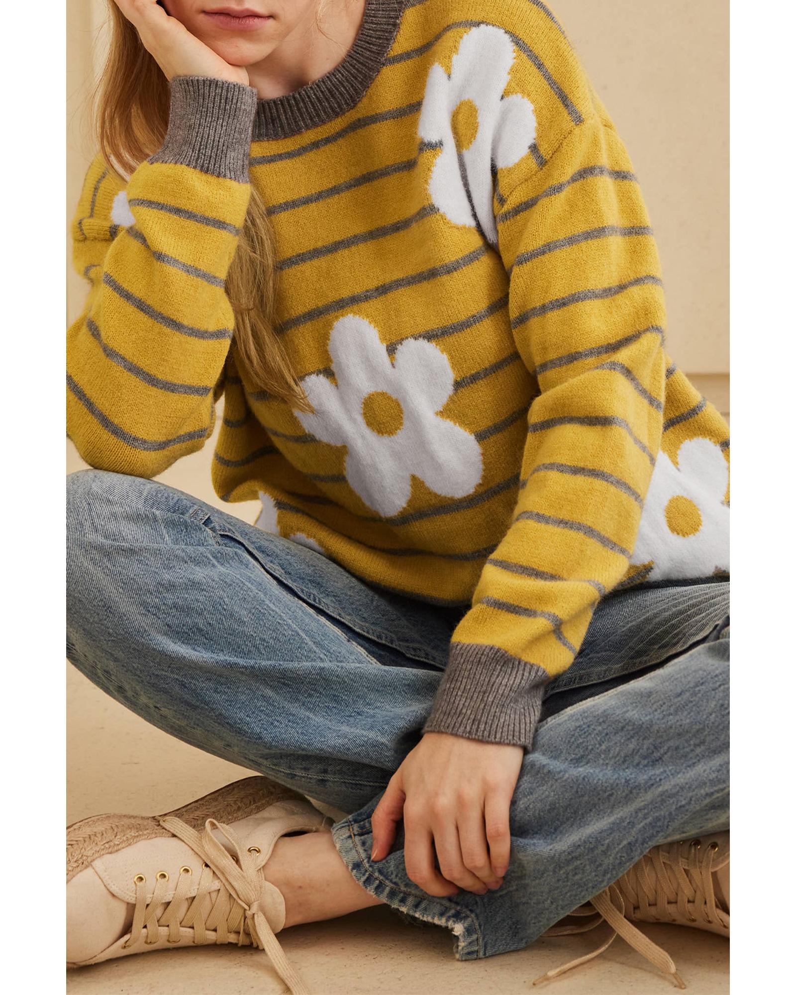 This yellow stripe daisy floral knitted sweater features a stylish design with a comfortable fit, making it a versatile addition to your wardrobe. Its classic round neck and dropped shoulder design provide a relaxed and trendy look, suitable for various casual occasions. The sweater is ideal for cooler weather and can be paired easily with jeans or skirts for a fashionable outfit.