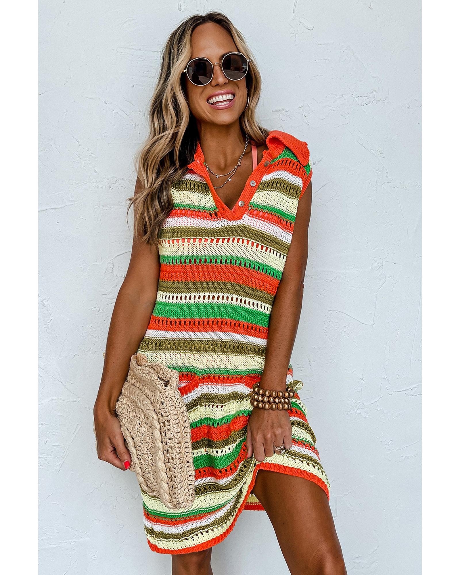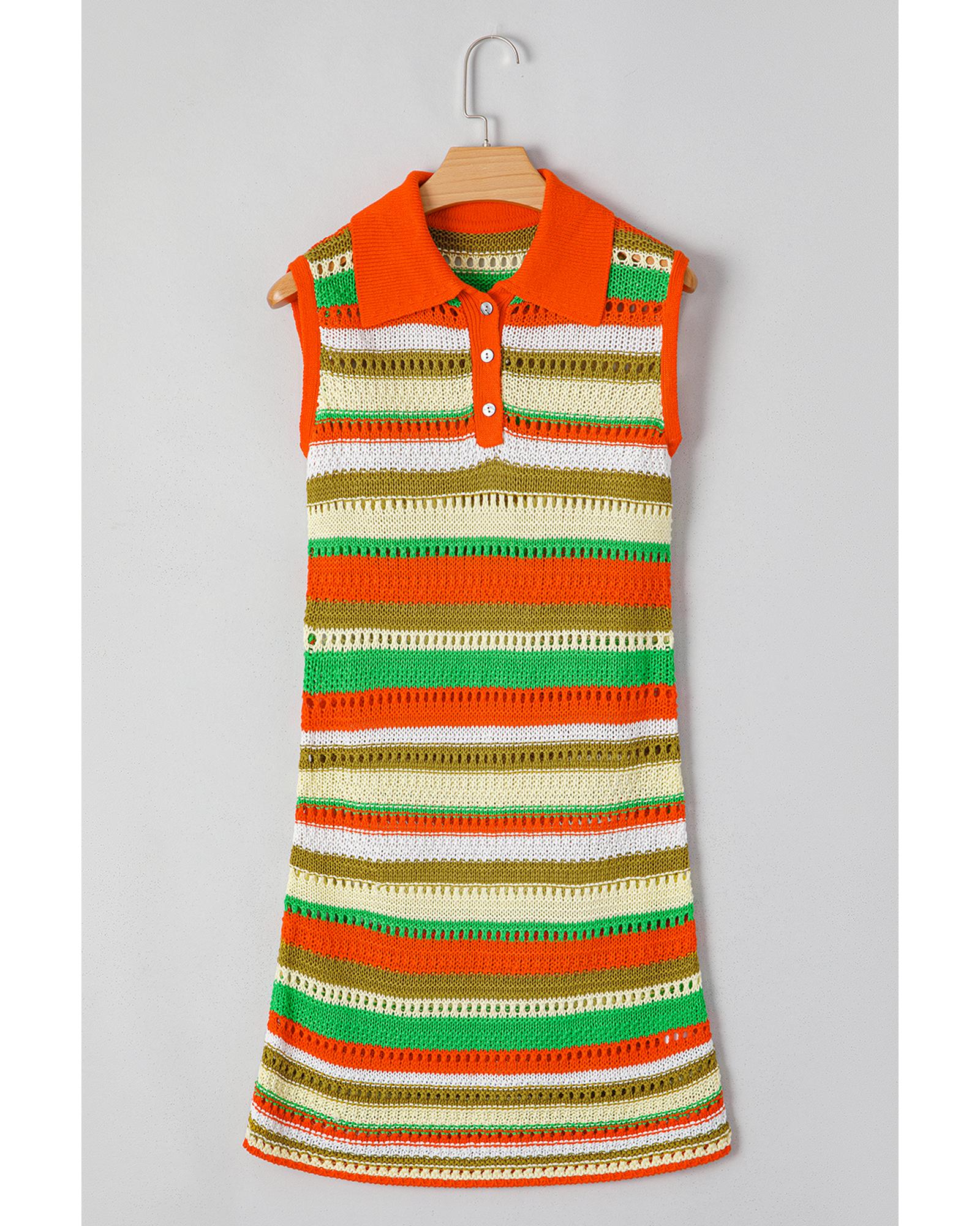 This sleeveless sweater dress features a stylish design suitable for spring and summer wear. It combines a vibrant striped pattern with a comfortable fit, making it an ideal choice for casual occasions. The dress is crafted from soft, breathable eyelet knit fabric, ensuring comfort throughout the day.