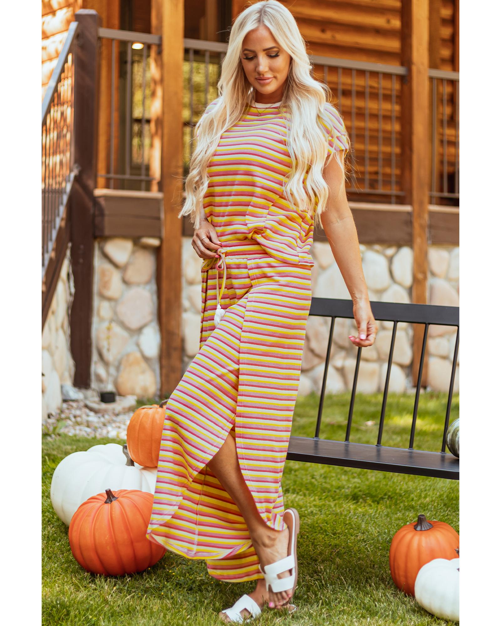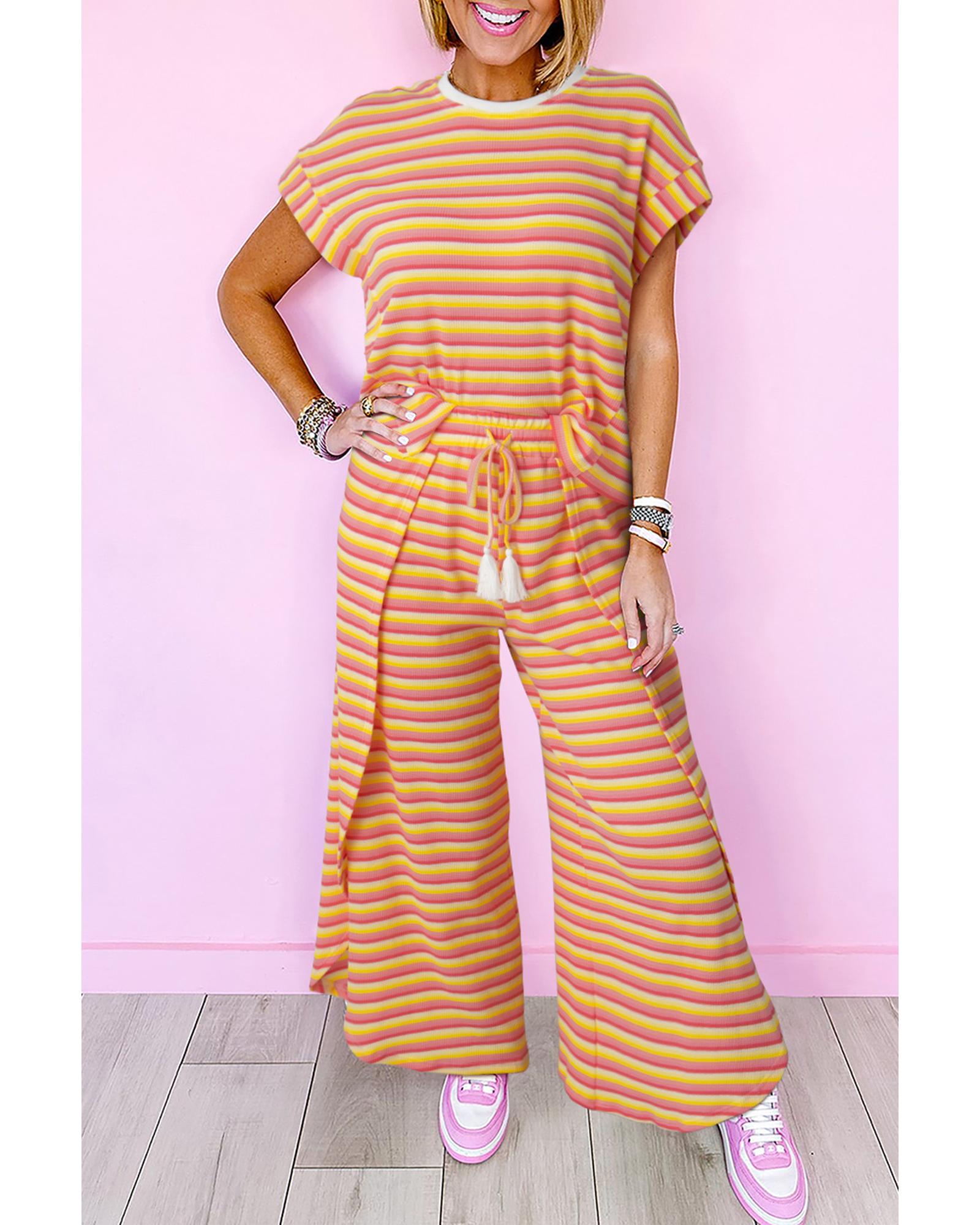 Yellow Stripe Rainbow Tee Tasseled String Wide Leg Pants Set – L