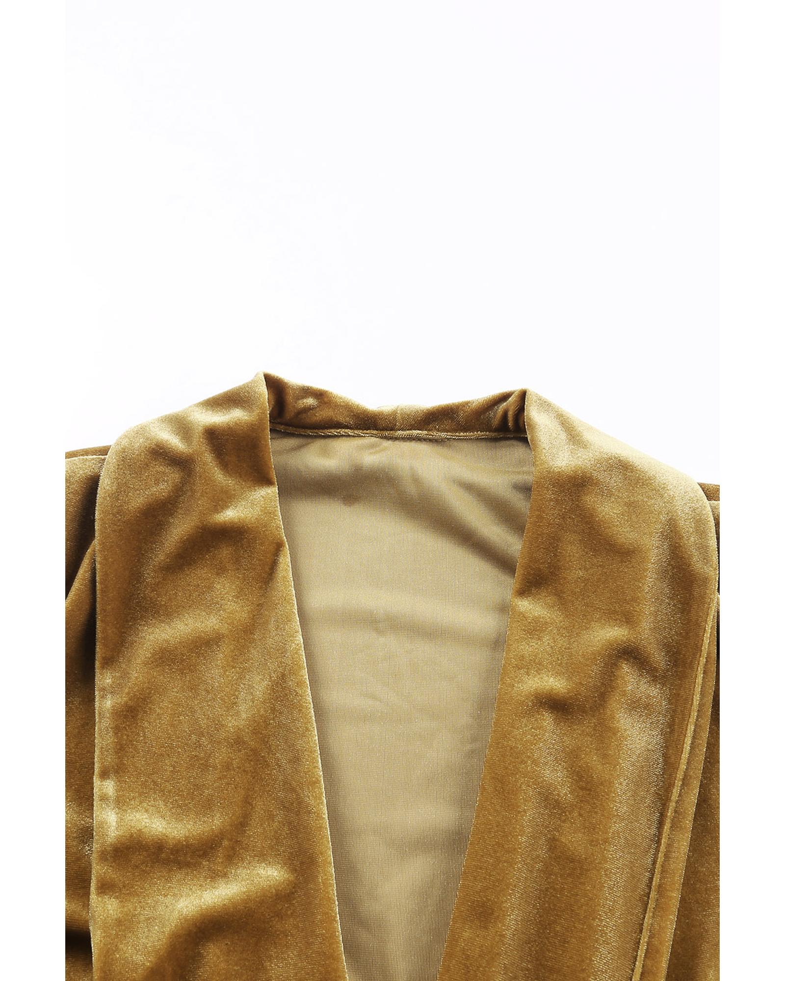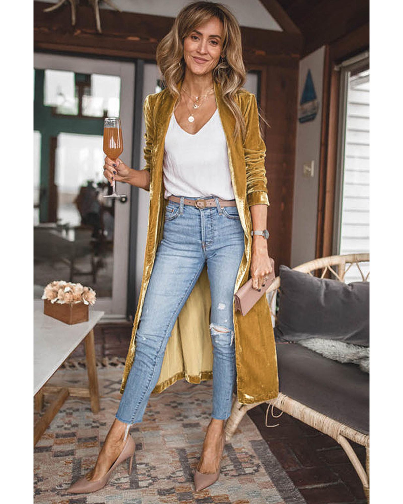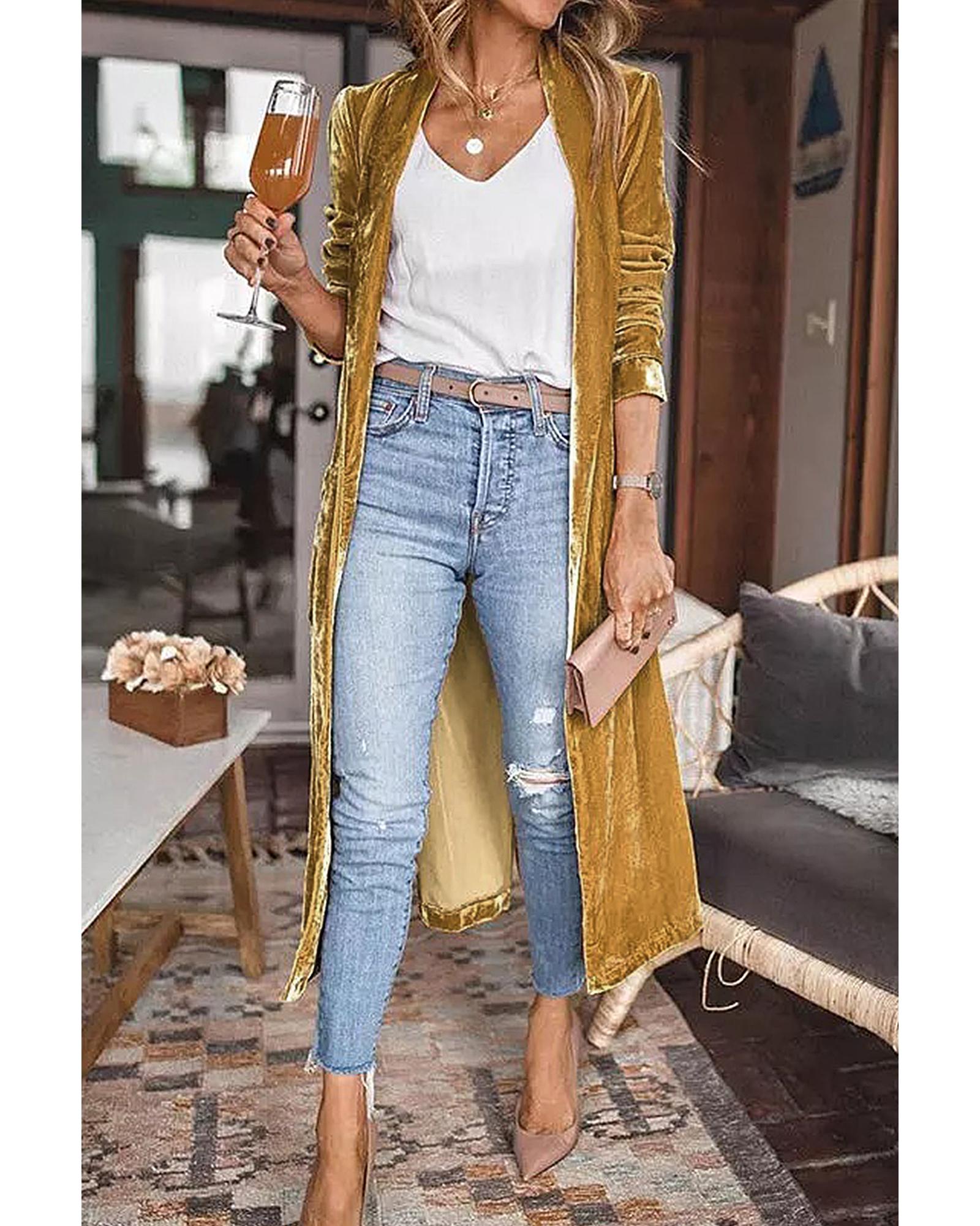 Yellow Velvet Open Front Pocketed Long Duster – L