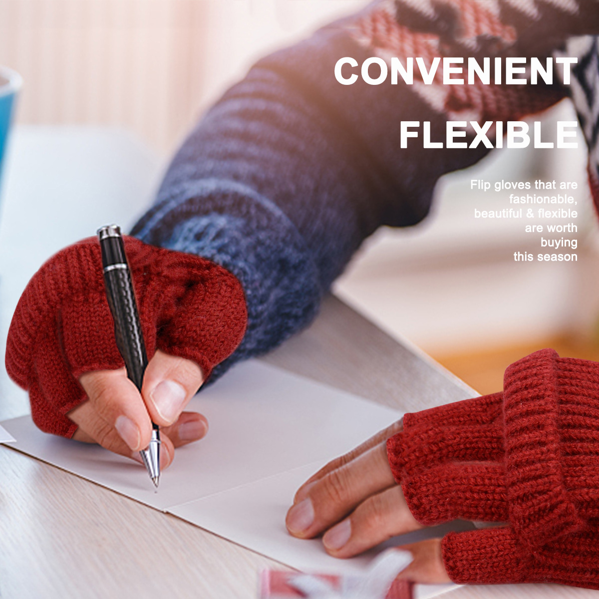 Wine Red Winter Convertible Mittens - Warm Knitted 2-in-1 Fingerless Gloves with Flip Top Cover for Cold Weather