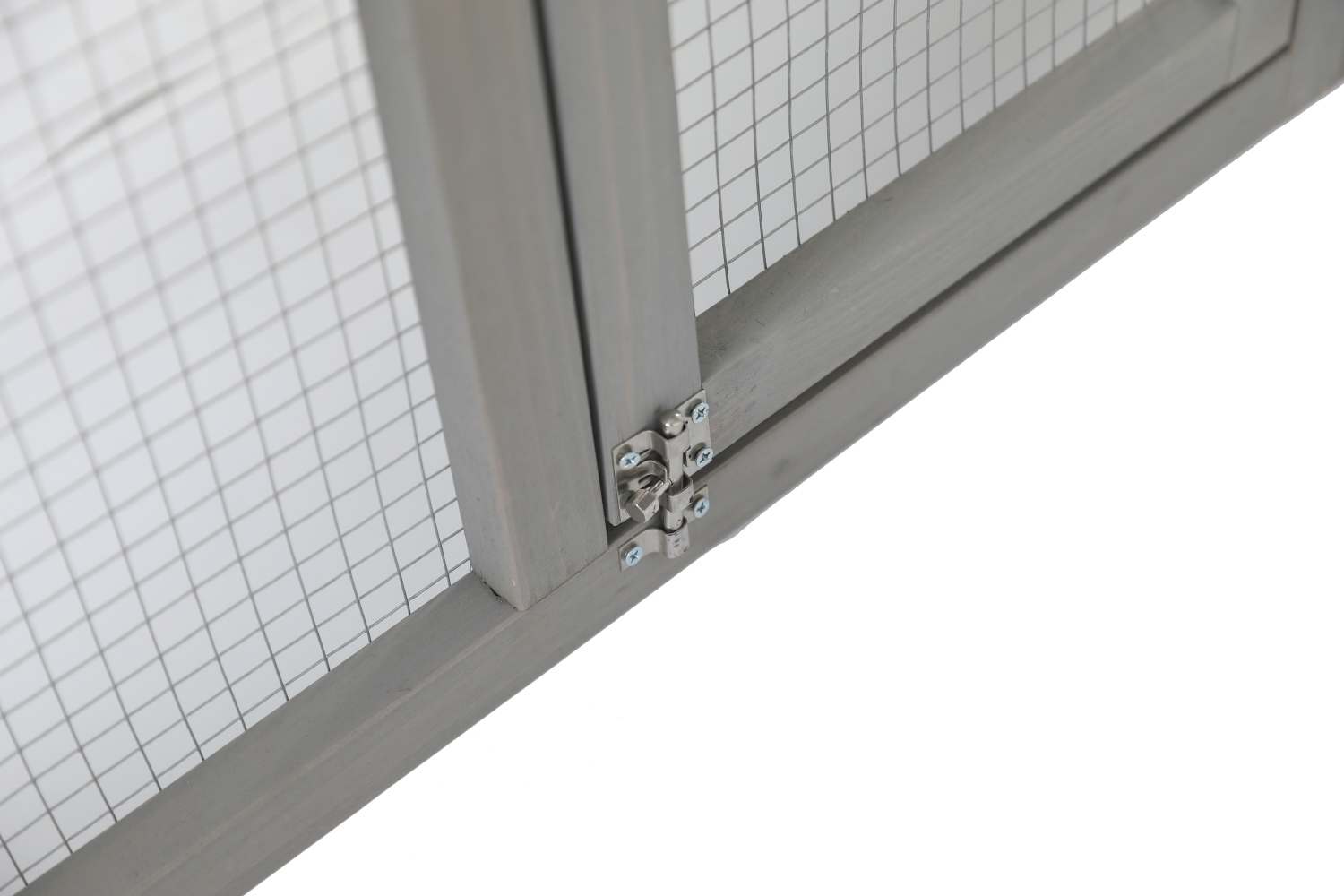 This wooden pet hutch provides a spacious and secure environment for small animals such as rabbits, guinea pigs, and quails. It features a double-story design with an enclosed ground area and a comfortable living space, offering both shelter and outdoor grazing space. The structure is designed for easy access and maintenance, making it a practical choice for pet owners.