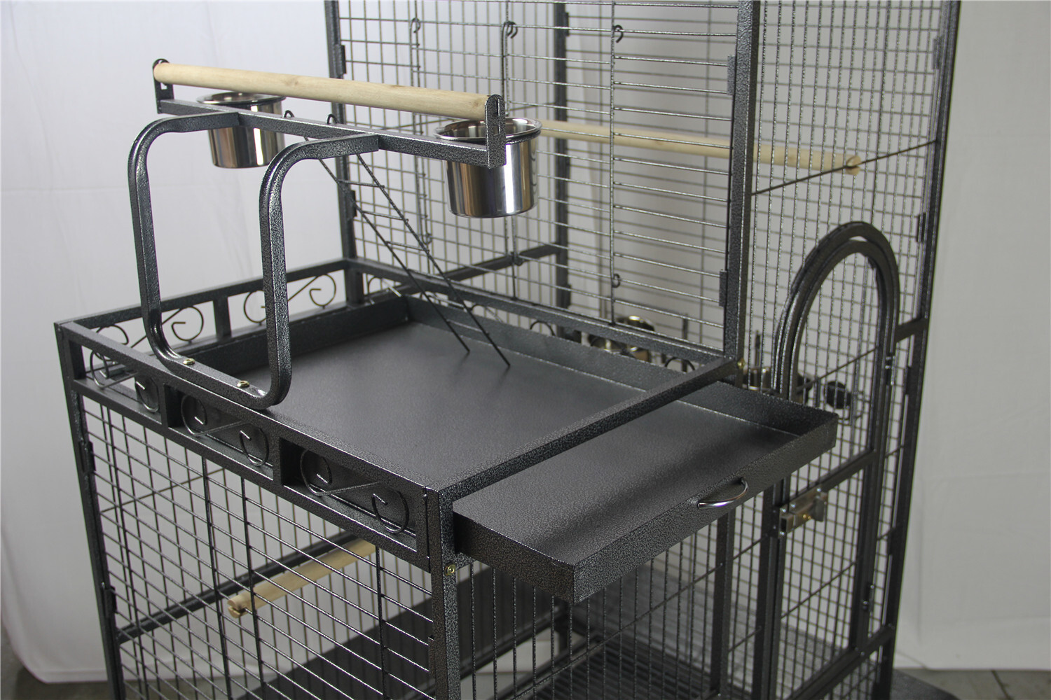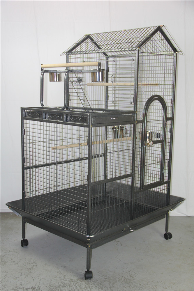 This bird cage is constructed from high-quality wrought iron with a non-toxic powder-coated finish, ensuring durability and safety for both the bird and the environment. It features a spacious design suitable for various bird species, with multiple access points for easy care and maintenance.