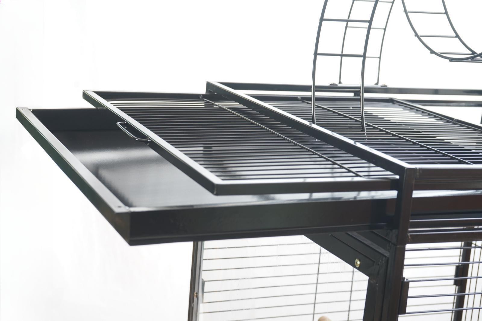 This large bird cage is designed for small birds, budgies, and parrots. Made from durable wrought iron with a non-toxic powder-coated finish, it provides a safe and eco-friendly environment for your pet. The cage features multiple access points and removable trays for easy cleaning and maintenance, along with various perches and play areas to keep your bird entertained.