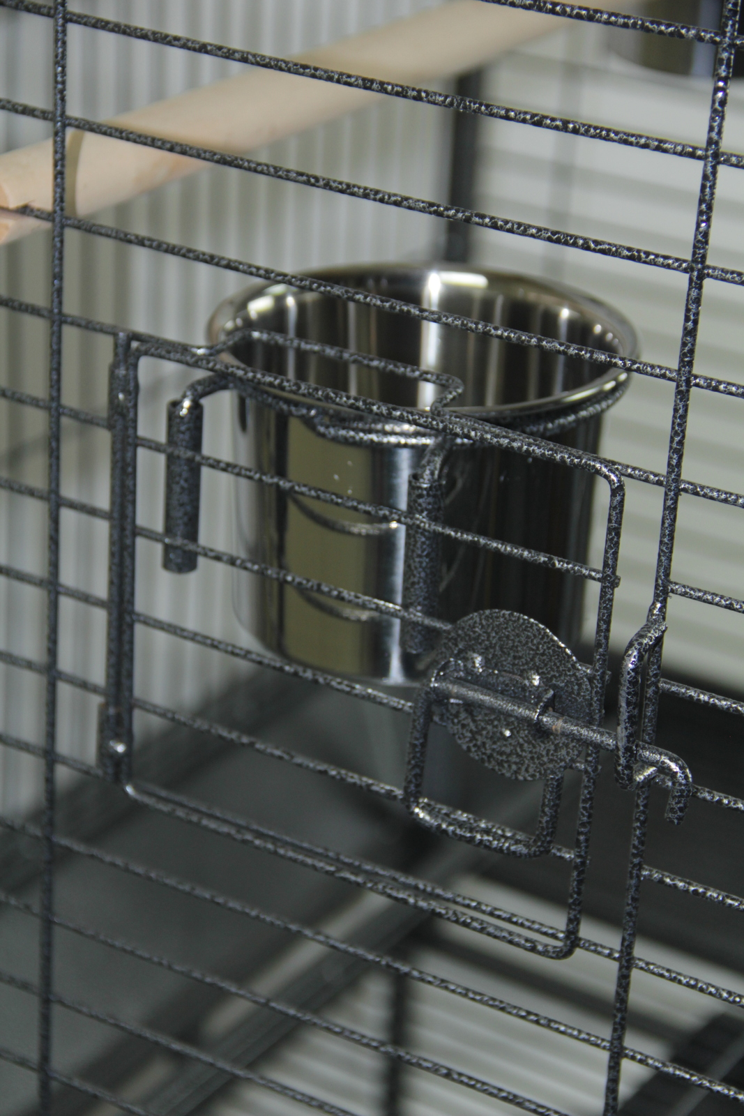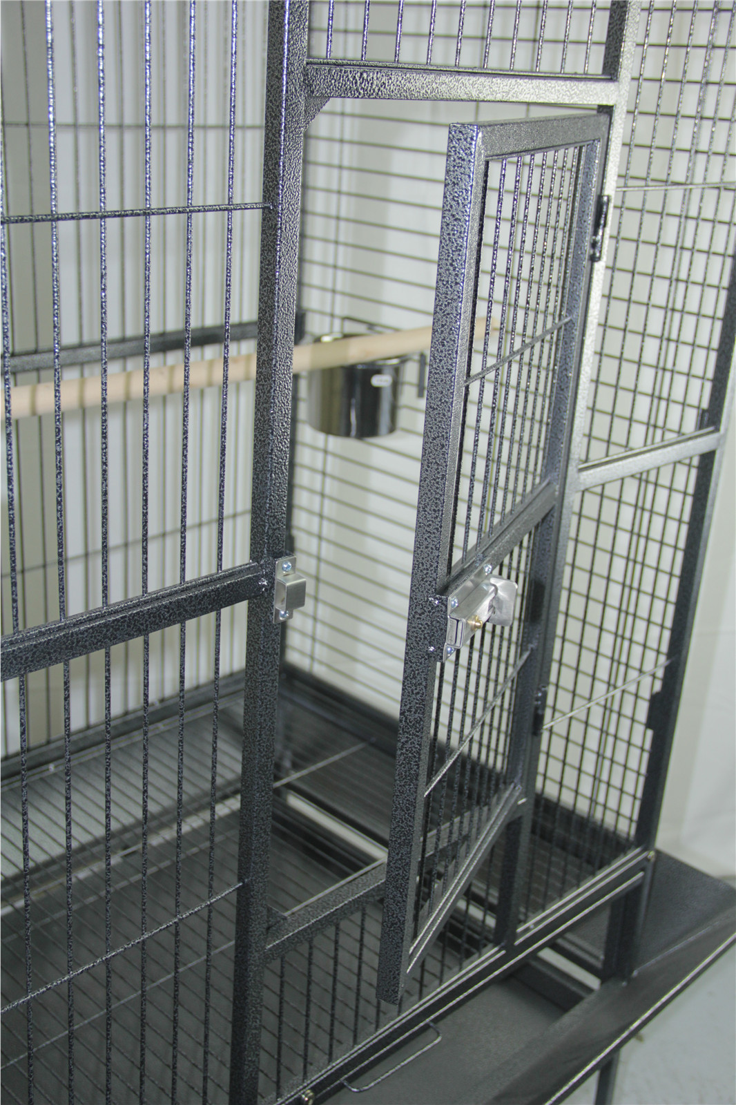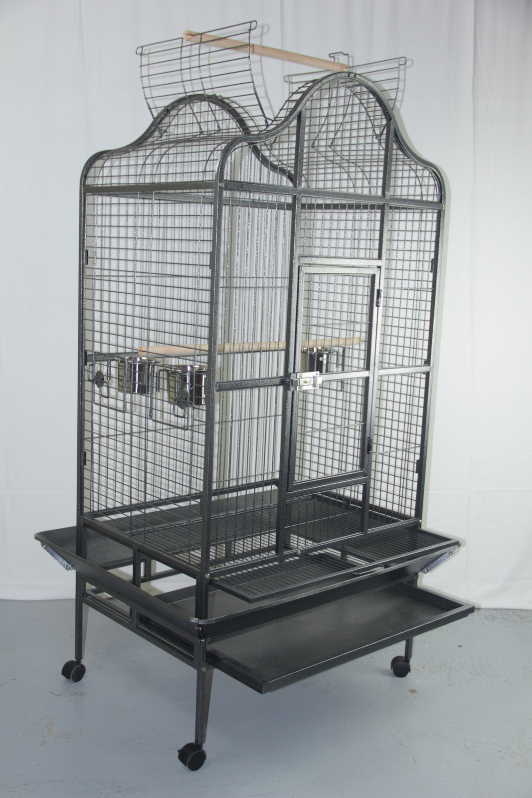 This spacious bird cage features an open top design, providing a comfortable and versatile environment for medium and large birds. Made of heavy-duty wrought iron with a vein powder-coated frame, it offers durability and stability. The cage includes multiple access points, removable trays for easy cleaning, and mobility wheels for convenience.