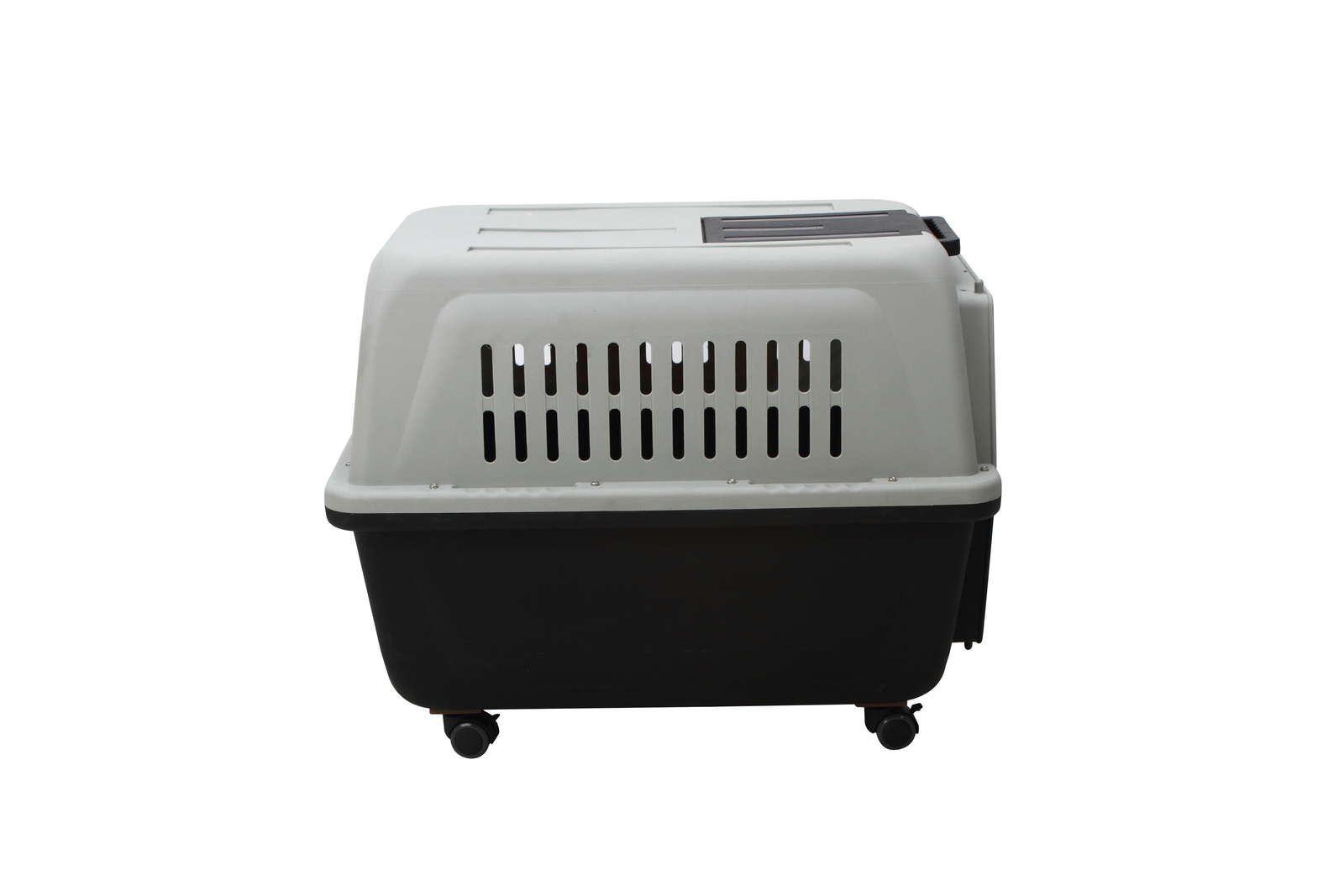 This large plastic pet carrier is designed for dogs and cats, offering a sturdy and durable construction with convenient features for easy transport and cleaning. It includes a handle and wheels for mobility, ventilation holes for airflow, and a secure door lock to ensure safety during travel.