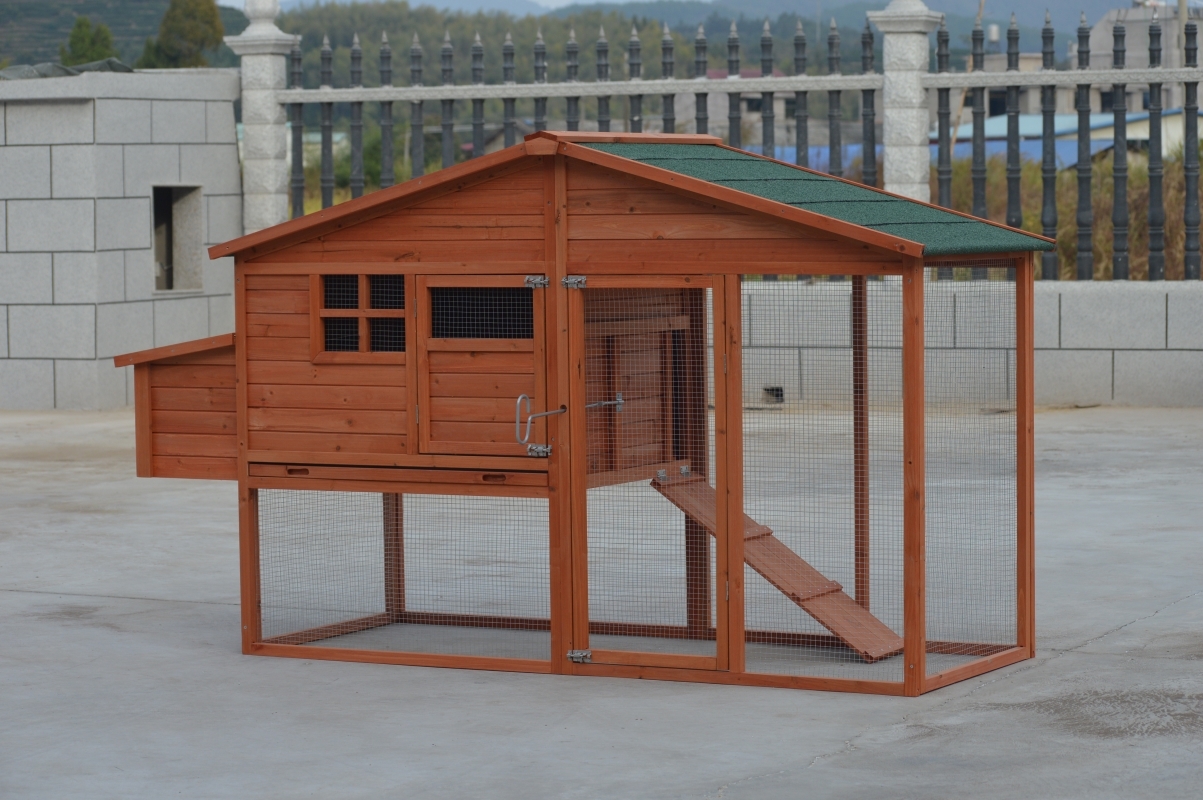 This product is a spacious chicken coop suitable for up to eight chickens. It is made from natural fir wood and mesh wire, featuring a durable and waterproof design. The coop includes multiple access points for easy cleaning and maintenance, as well as integrated nesting boxes with roof access for egg collection. It is designed for safety and convenience, with removable perches and a pull-out tray for cleaning. The package is shipped in flatpack form with clear assembly instructions.