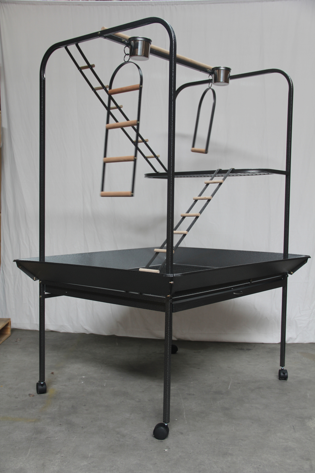 • Large metal swing ladder, multiple wooden perches, and stainless steel bowls