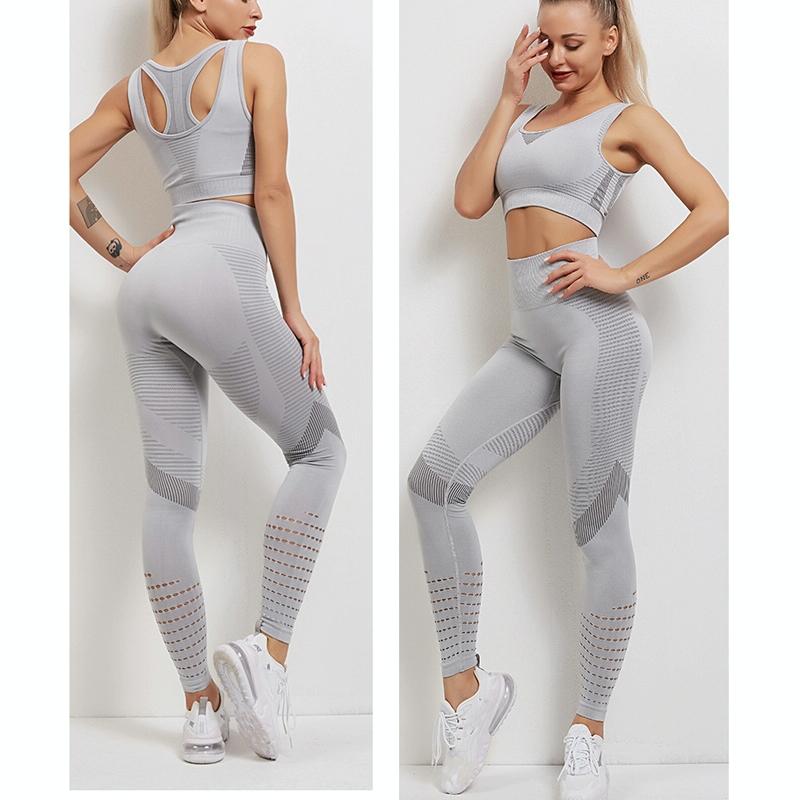 This yoga fitness set for women includes a sports bra and leggings designed for comfort and style. The set features lightweight, breathable, and stretchy fabric, a seamless high waist design, and a tummy-tightening effect to enhance your natural curves. The sports bra is wire-free with wide shoulder straps, providing support and comfort during workouts. The leggings are crafted to outline the hips and thighs, offering a flattering fit for active wear.